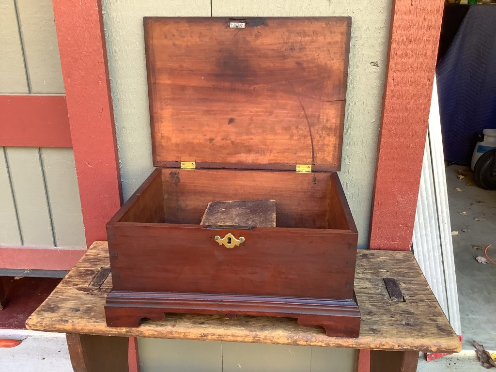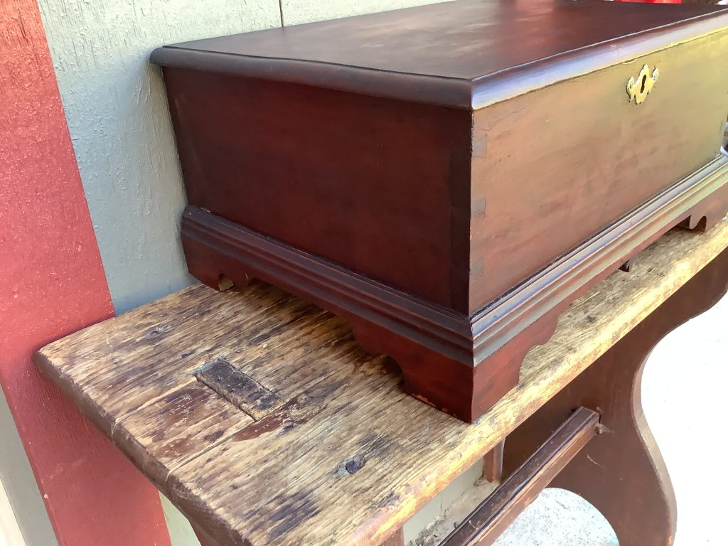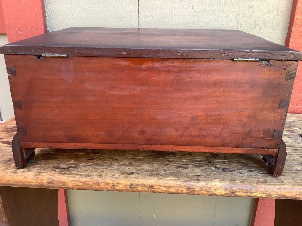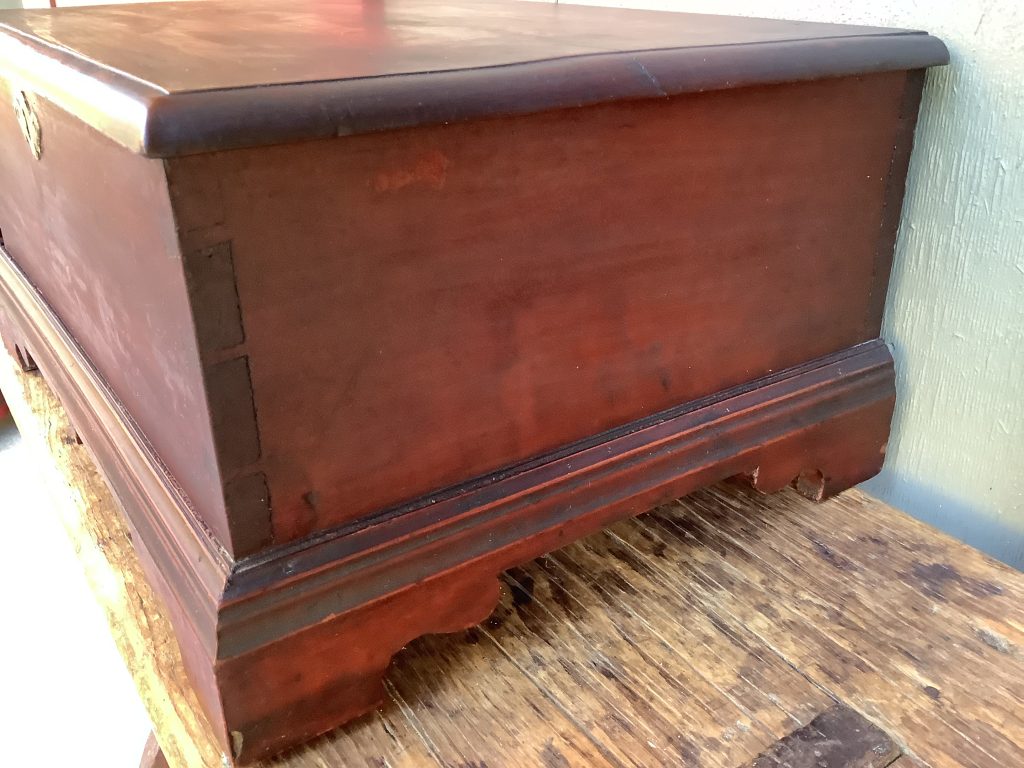A CHIPPENDALE CHERRY BIBLE BOX WITH DOVETAILED CONSTRUCTION RAISED ON BRACKET FEET. THE BOX RETAINS AN EARLY SURFACE (POSSIBLY ORIGINAL) WITH THE ORIGINAL ESCUTCHEON. DROP PENDANT AND EARLY REPLACED BUTT HINGES. THE BOX ORIGINALLY HAD SNIPE HINGES. THE BOX WAS FOUND IN PHILADELPHIA AND VERY POSSIBLY ITS PLACE OF ORIGIN. A BEAUTIFUL BOX IN MAGNIFICENT CONDITION.(BTRKDE)