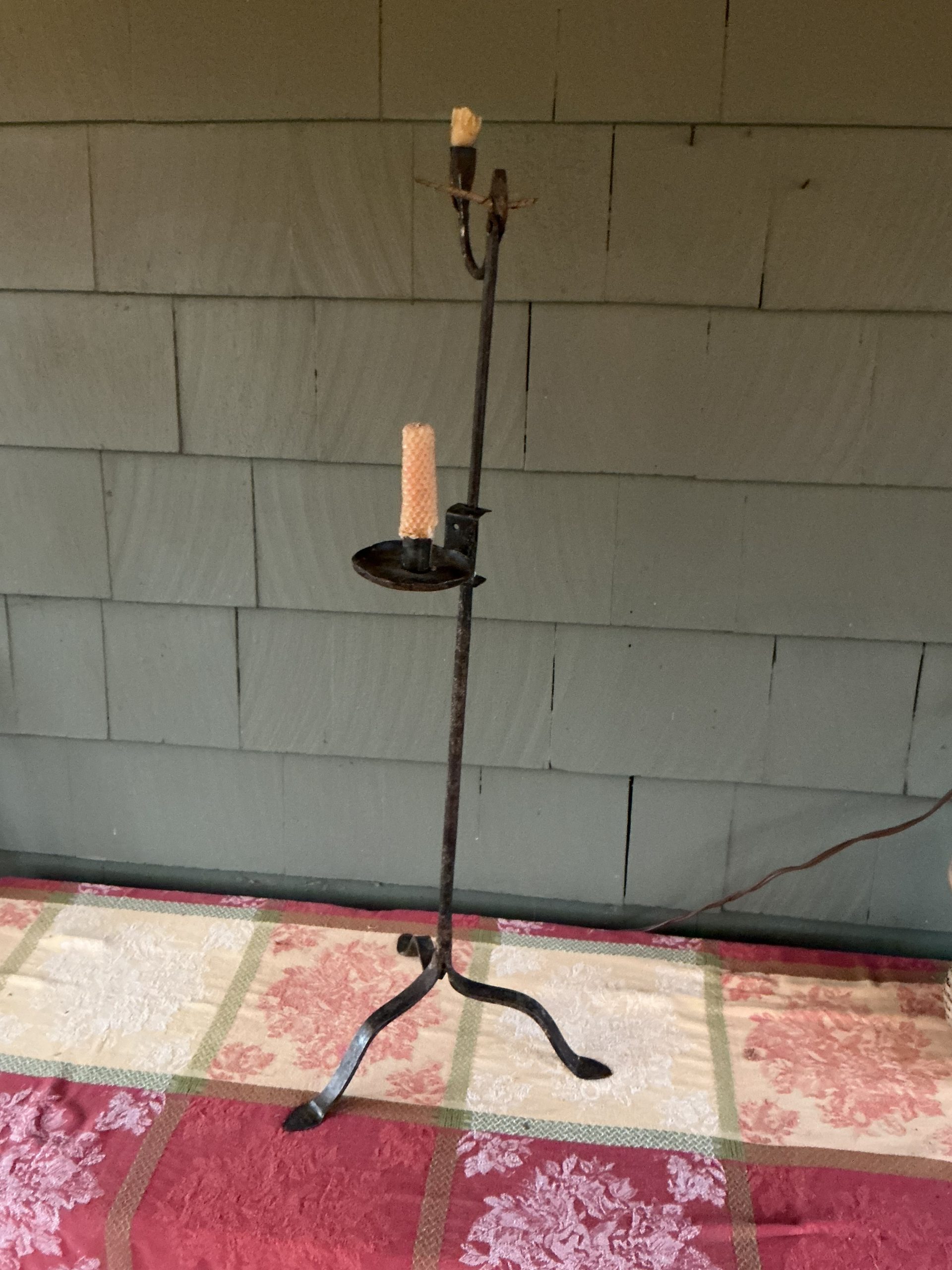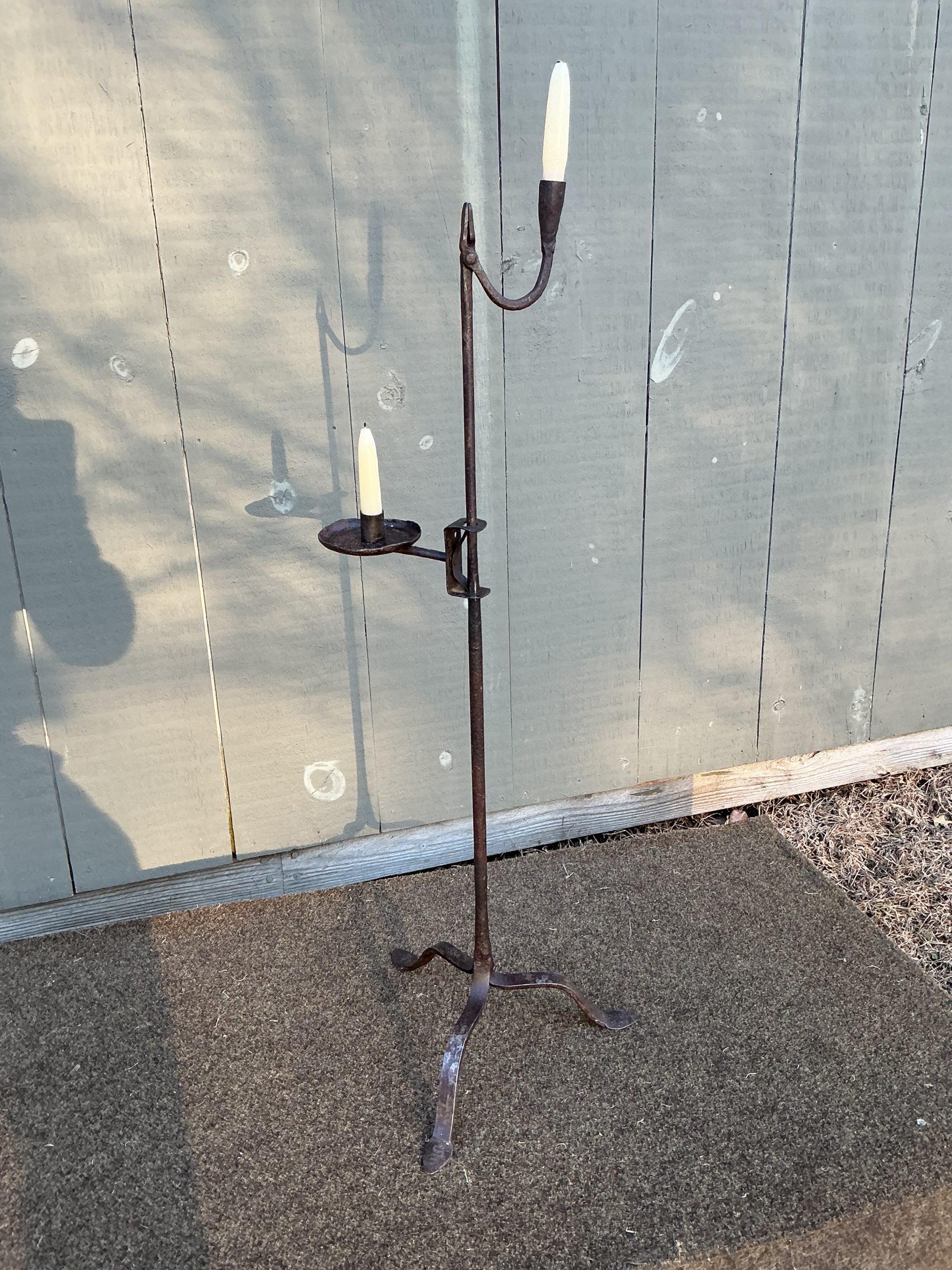 IT IS ALWAYS AMAZING HOW MANY DIFFERENT WI FLOOR LAMPS THERE ARE AND ONE VERY SELDOM SEES TWO THAT ARE THE SAME. THIS FLOOR LAMP IS QUITE UNIQUE WITH THE DOUBLE CANDLE, RUSH HOLDER AND THREE LEGS WITH ARROW FEET. ONE CANDLE HOLDER IS STATIONARY AND WORKS WITH THE RUSH PINCHERS WHILE THE OTHER CANDLE HOLDER HAS A DRIP PAN AS WELL AS HORIZONTAL AND VERTICAL MOVEMENT. AN ATTRACTIVE DESIGN AND VERY FUNCTIONAL.