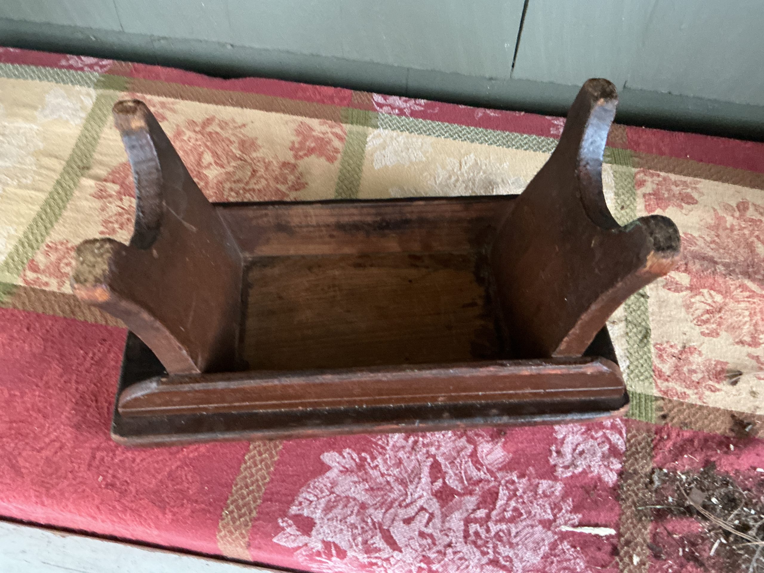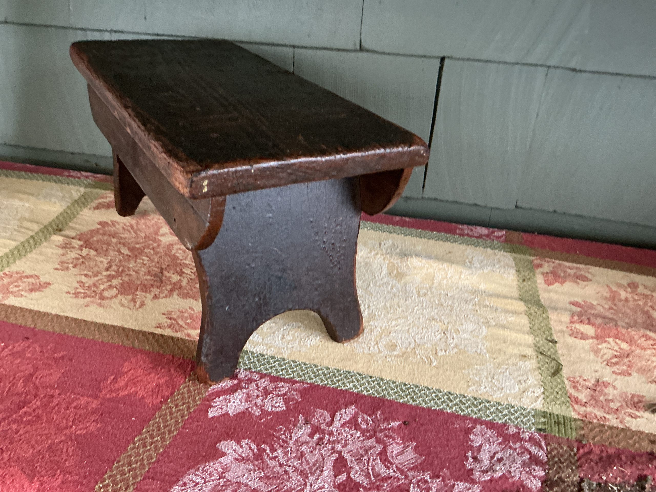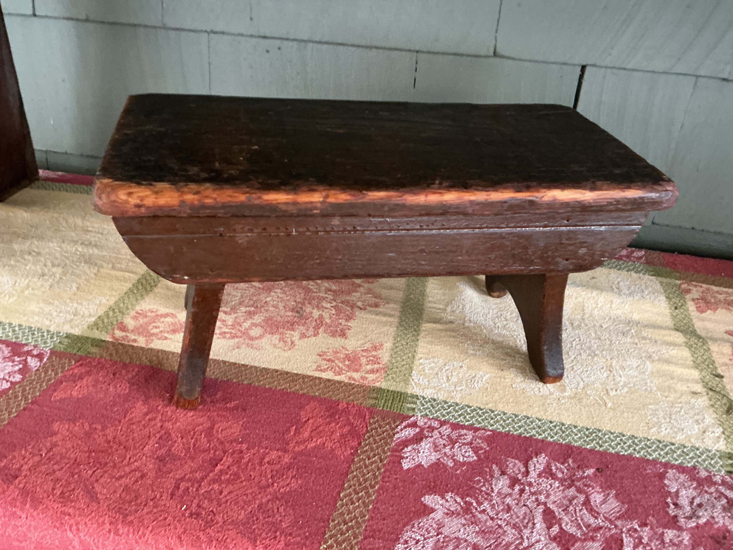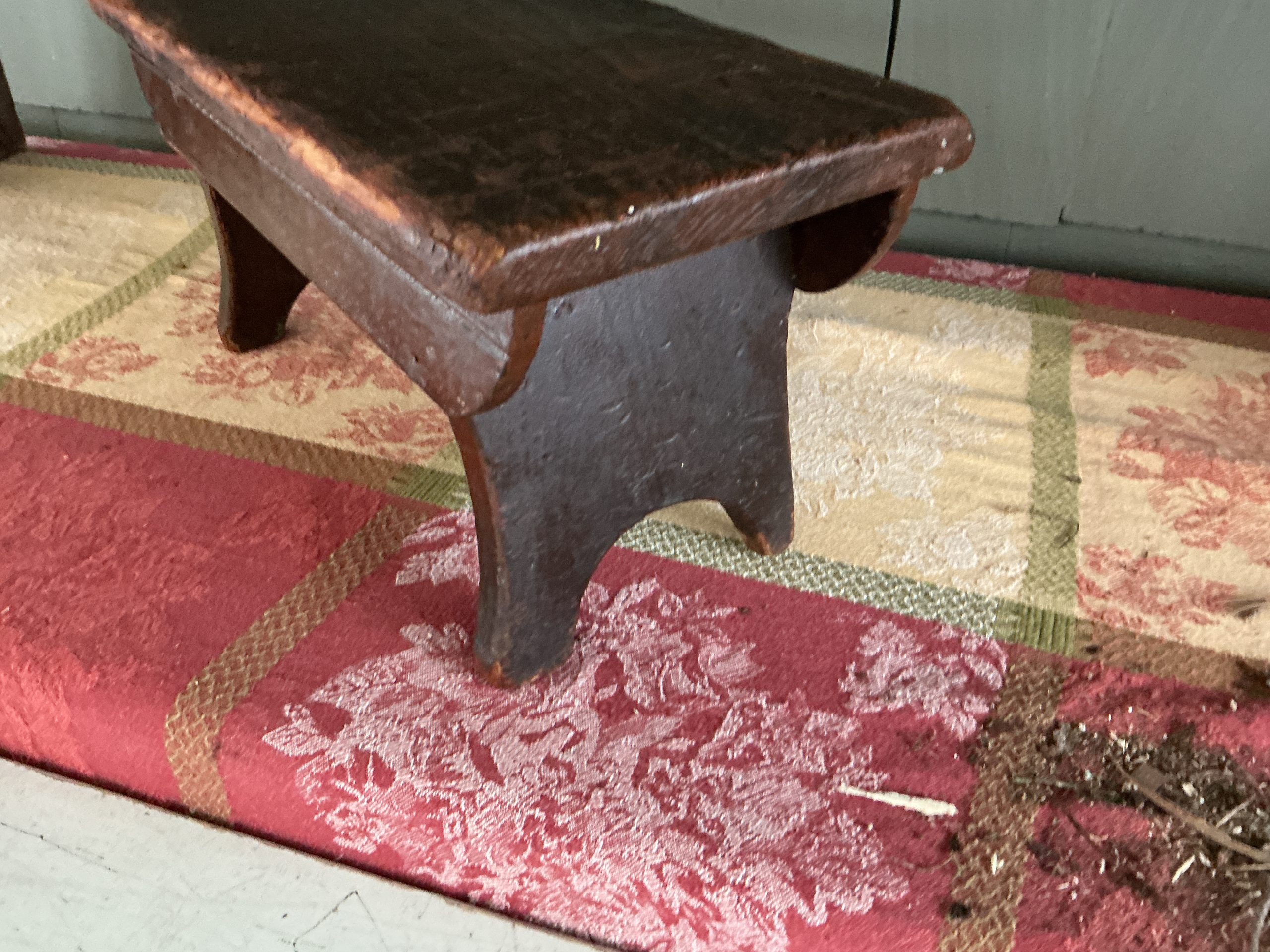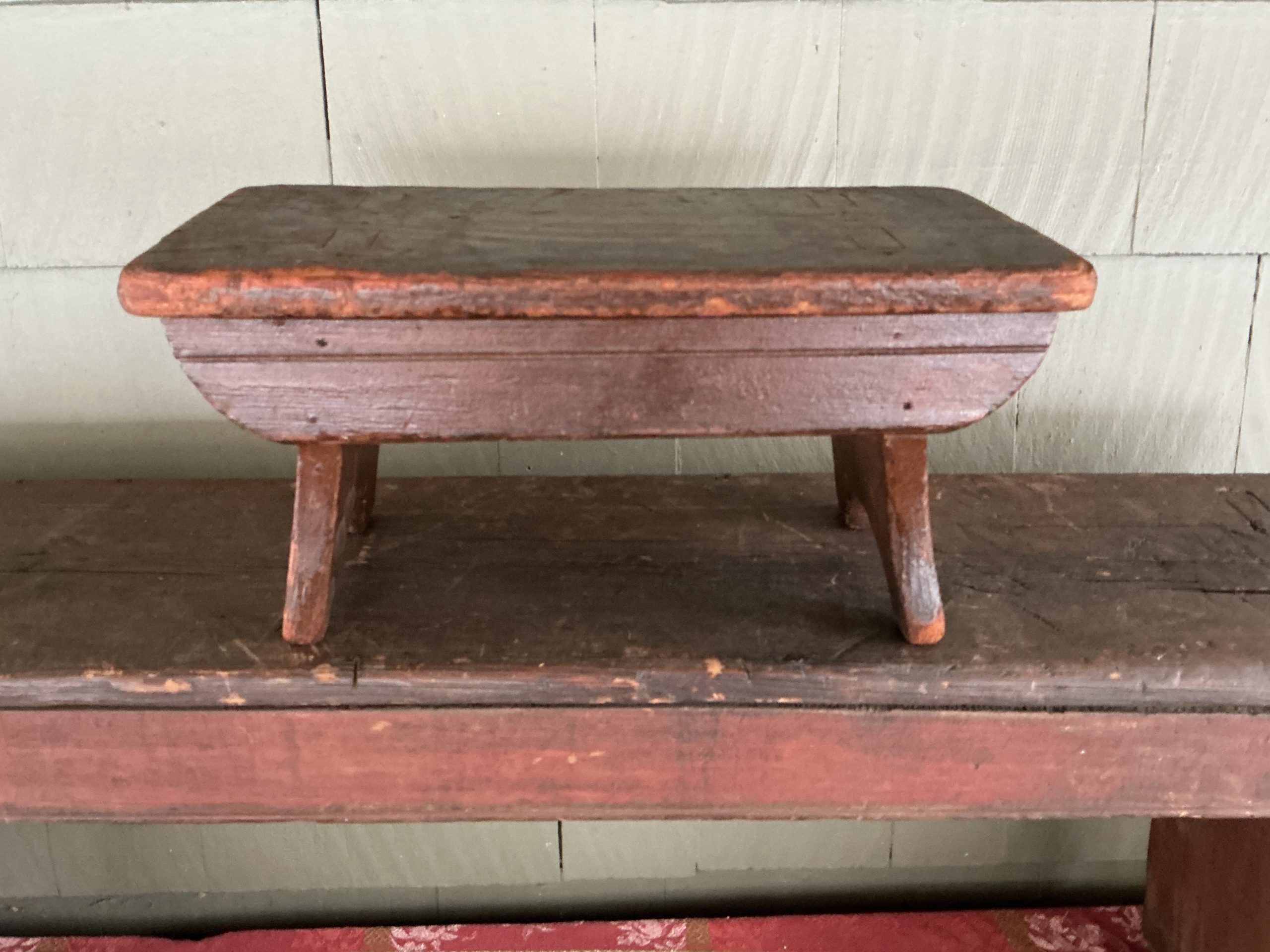 Home / Recent Additions: New to the website and Special Items / MORTISED, PAINTED FOOT STOOL ca:1800 MORTISED, PAINTED FOOT STOOL ca:1800 Description Description MORTISED PAINTED FOOT STOOL WITH ARCHED AND SPLAYED LEGS. INSICED APRON ON BOTH SIDES. T-NAIL CONSTRUCTION. WONDERFUL CONDITION AND VERY STRONG. 16”L X 8”W X 8 1/4”H LISTEN PRICE: $145