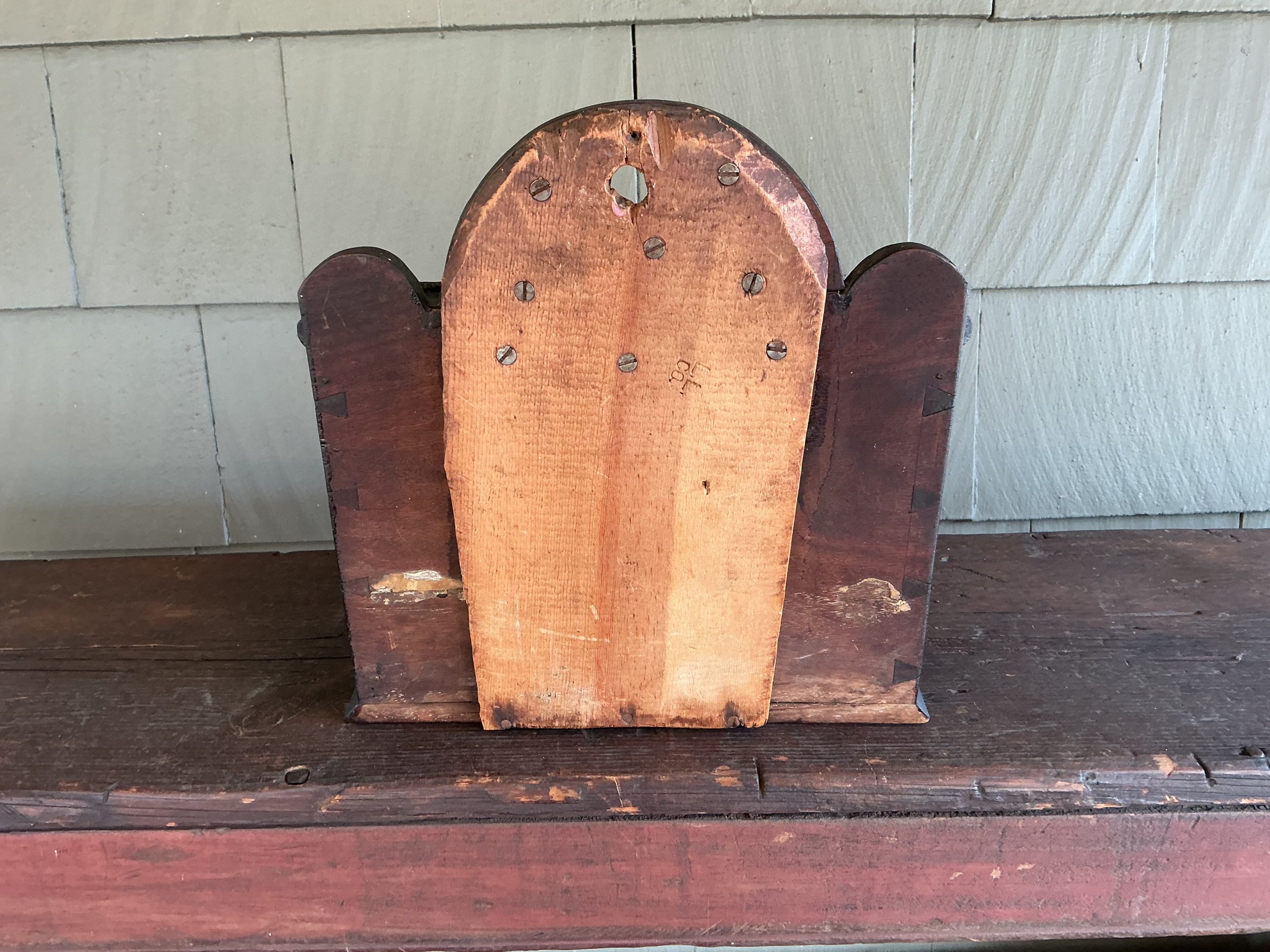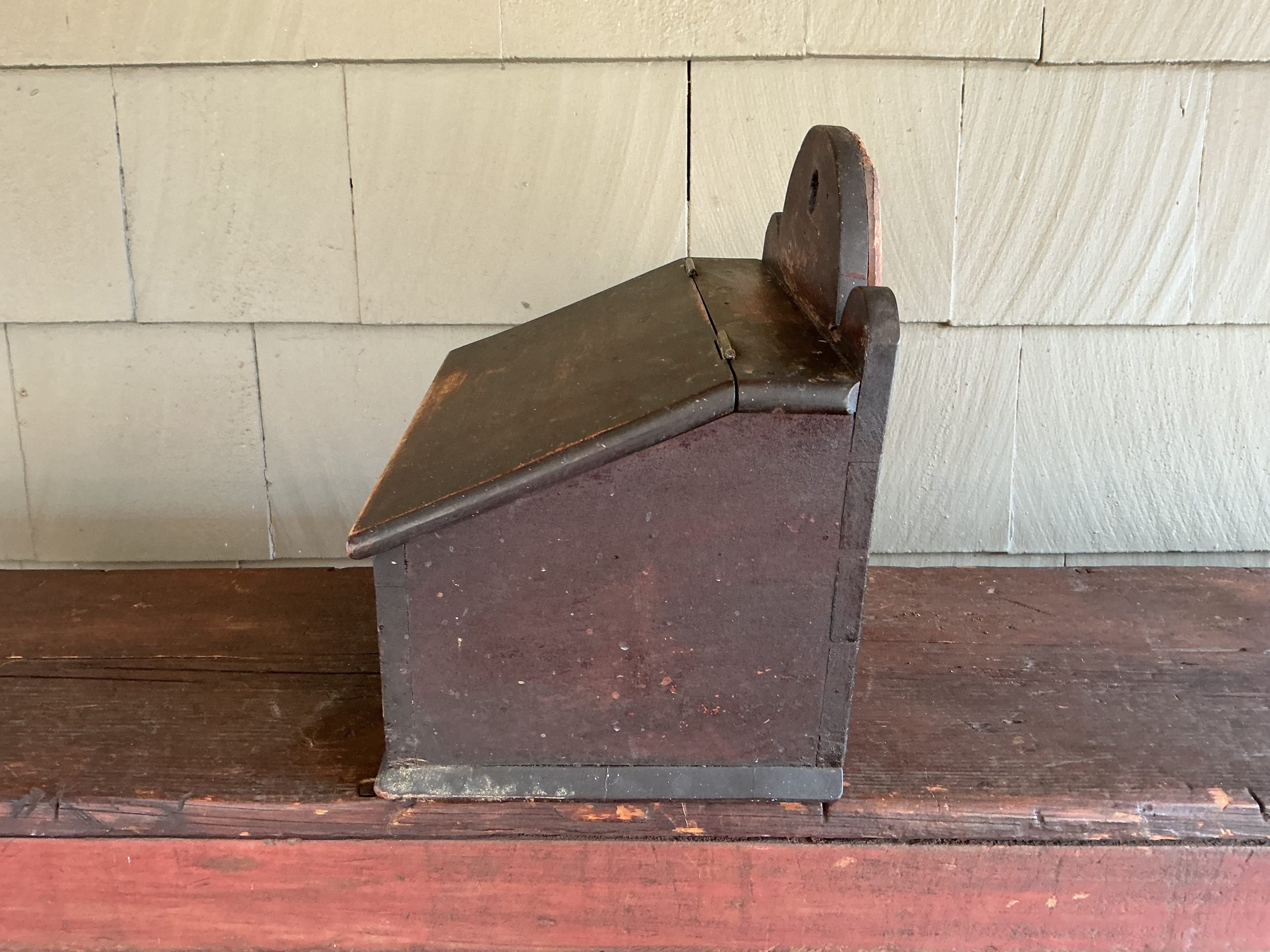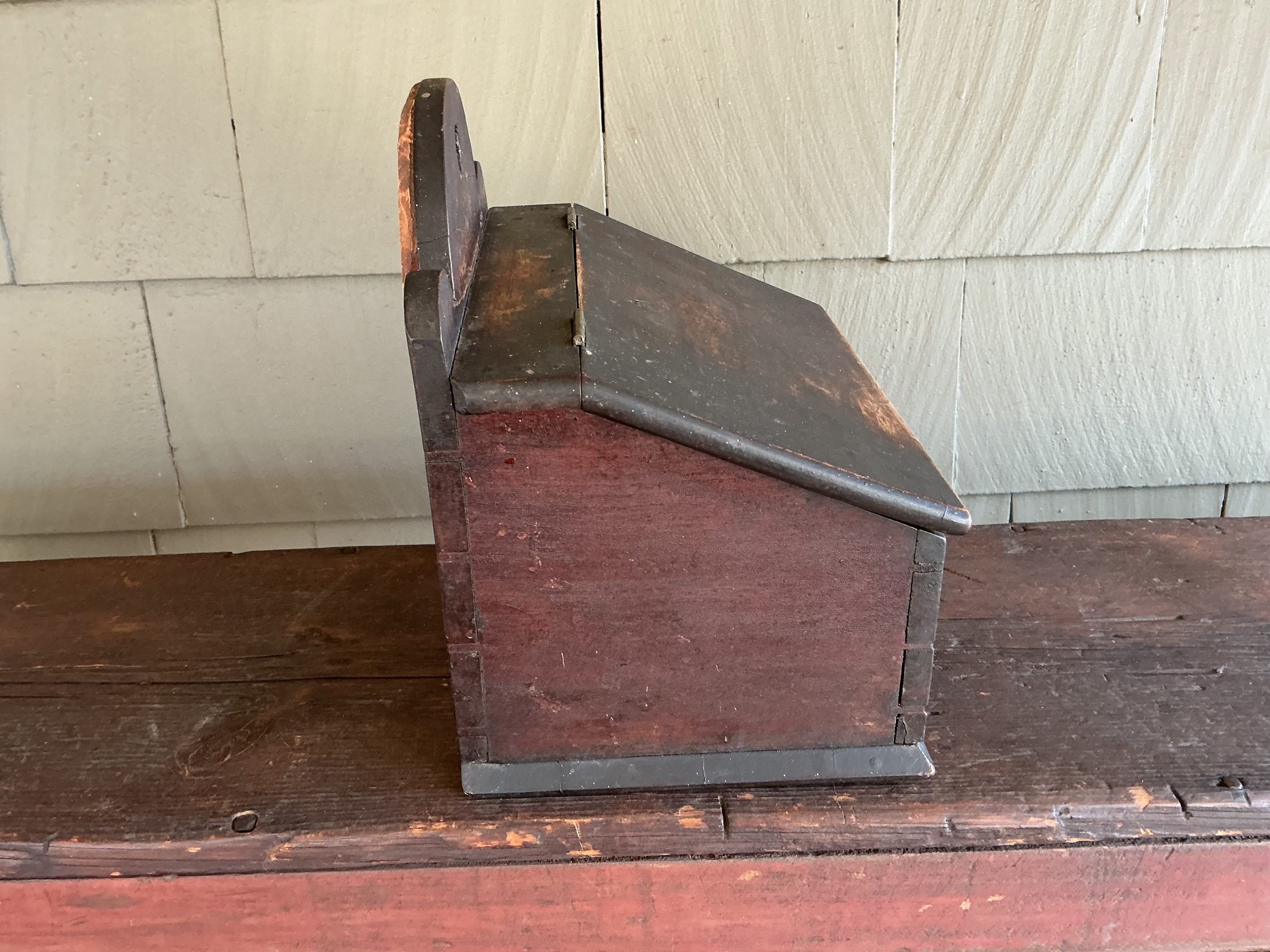 A QUALITY PAINTED AND DOVETAILED NEW ENGLAND BOX WITH SLANTED LID AND ARCHED BACK. THE BOX WAS MADE FROM THAT OLD THICK WOOD WHICH WAS COMMON TO THE QUALITY BOXES MADE DURING THAT PERIOD. THE SLANTED LID RETAINS ITS ORIGINAL HINGES AND OPENS TO A DIVIDED INTERIOR. THE BASE IS ATTACHED WITH SQUARE NAILS. WHILE THE BOX RETAINS ITS ORIGINAL PAINT AND IS IN OUTSTANDING CONDITION, THERE IS A LATER EXCELLENT REPAIR THAT REINFORCES THE MIDDLE ARCH. THE EXCELLENT REPAIR IS WHAT ONE WOULD EXPECT OF A NEW ENGLAND CRAFTSMAN! THE BOX CAN SIT ON A TABLE OR HANG ON THE WALL.
