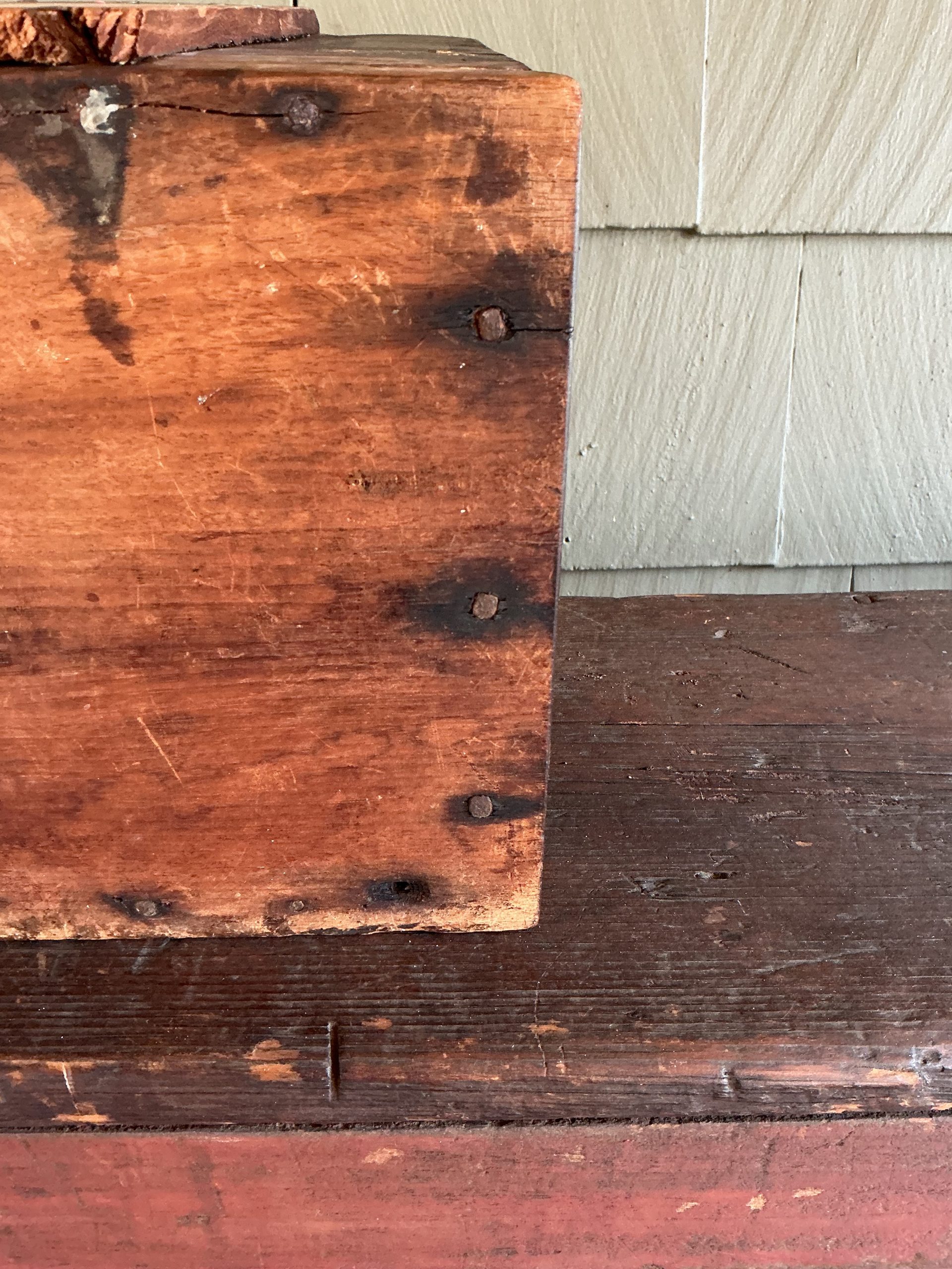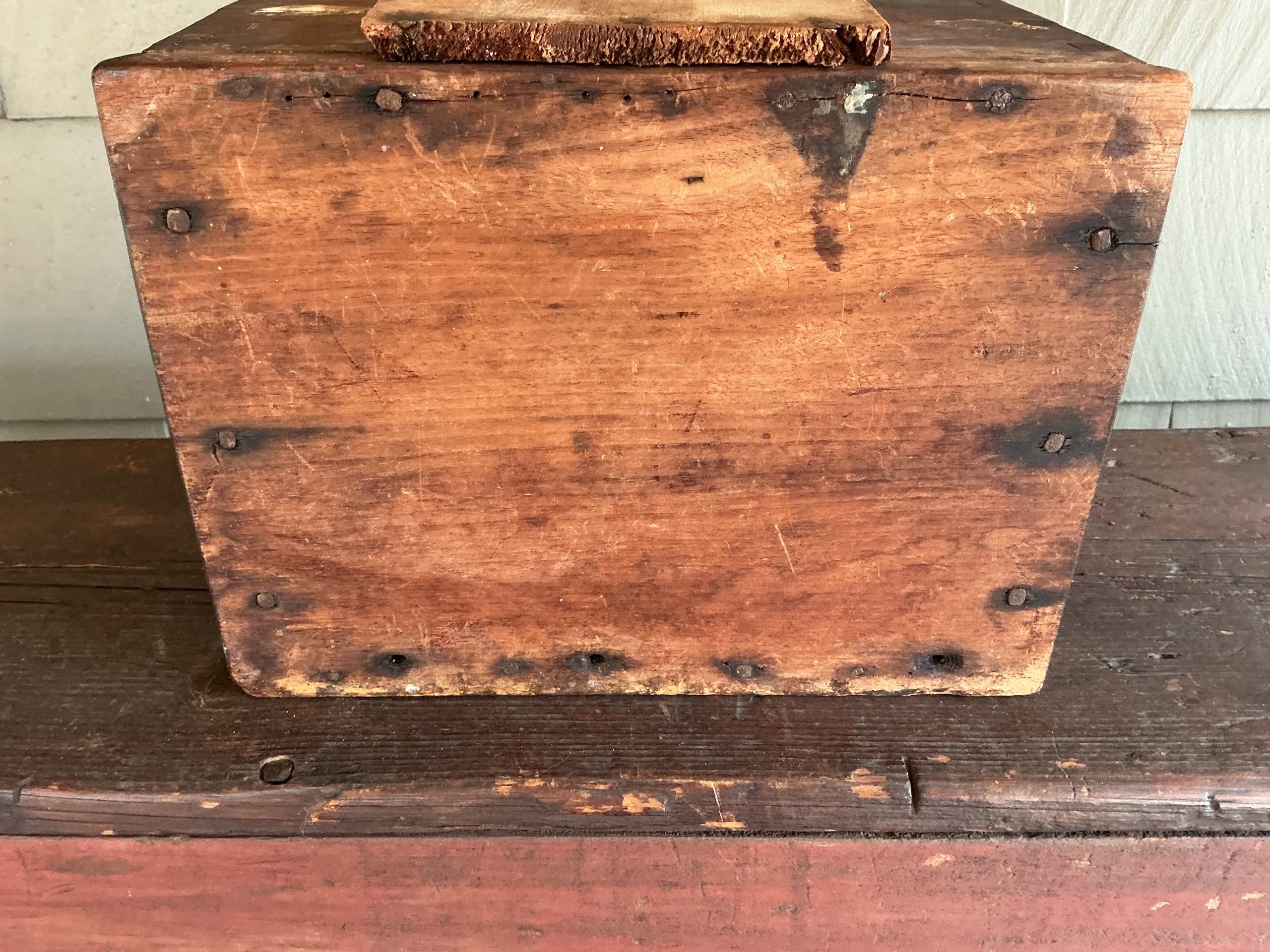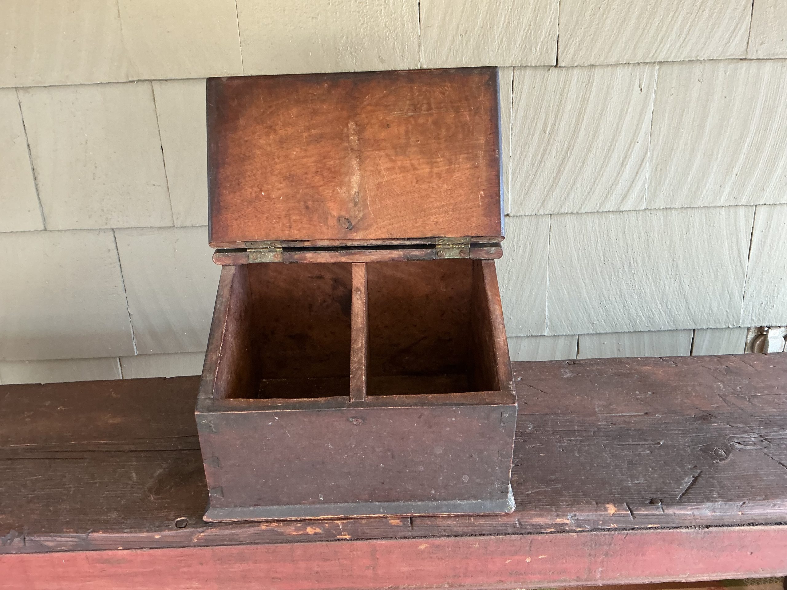 A QUALITY PAINTED AND DOVETAILED NEW ENGLAND BOX WITH SLANTED LID AND ARCHED BACK. THE BOX WAS MADE FROM THAT OLD THICK WOOD WHICH WAS COMMON TO THE QUALITY BOXES MADE DURING THAT PERIOD. THE SLANTED LID RETAINS ITS ORIGINAL HINGES AND OPENS TO A DIVIDED INTERIOR. THE BASE IS ATTACHED WITH SQUARE NAILS. WHILE THE BOX RETAINS ITS ORIGINAL PAINT AND IS IN OUTSTANDING CONDITION, THERE IS A LATER EXCELLENT REPAIR THAT REINFORCES THE MIDDLE ARCH. THE EXCELLENT REPAIR IS WHAT ONE WOULD EXPECT OF A NEW ENGLAND CRAFTSMAN! THE BOX CAN SIT ON A TABLE OR HANG ON THE WALL.