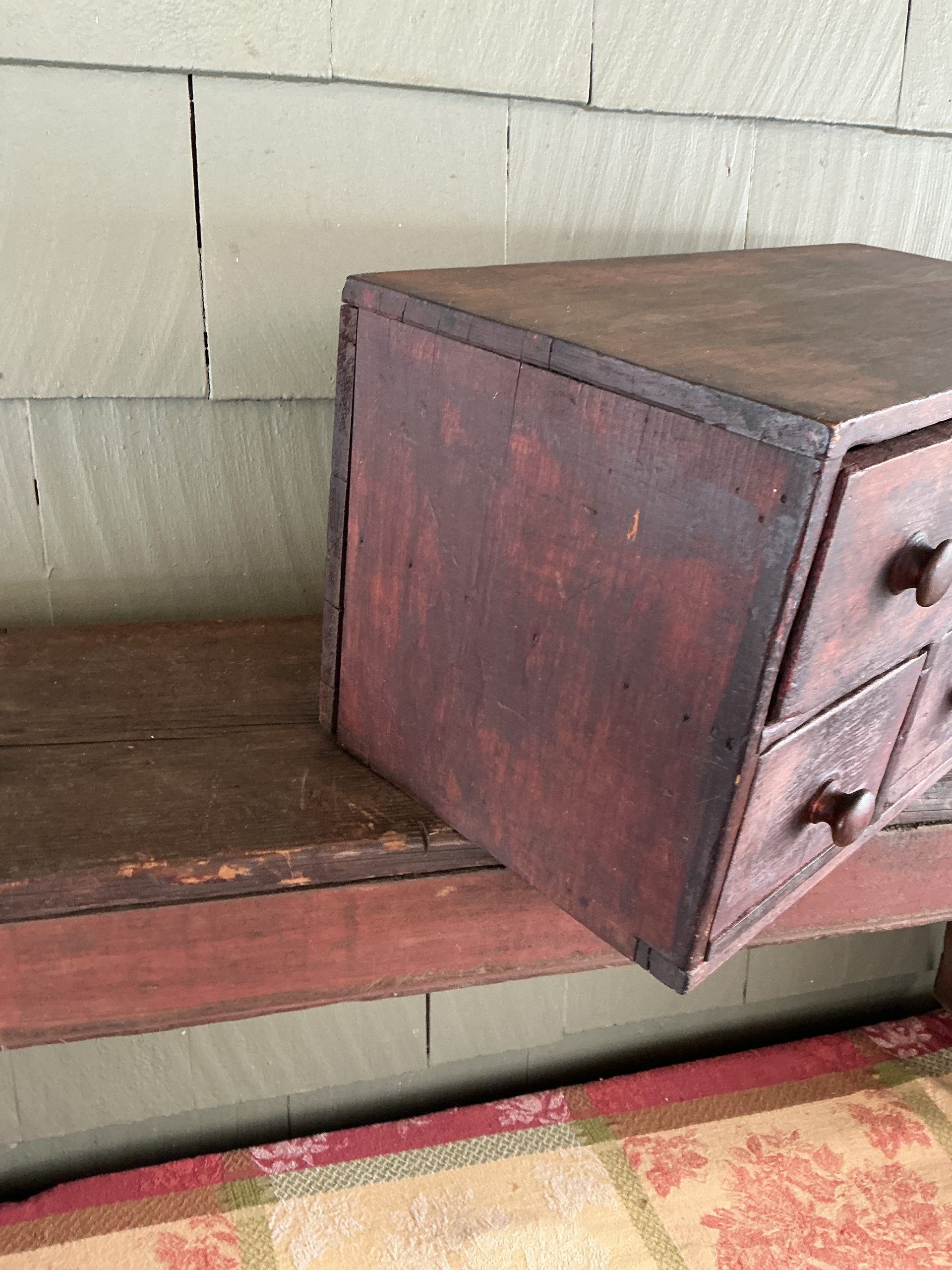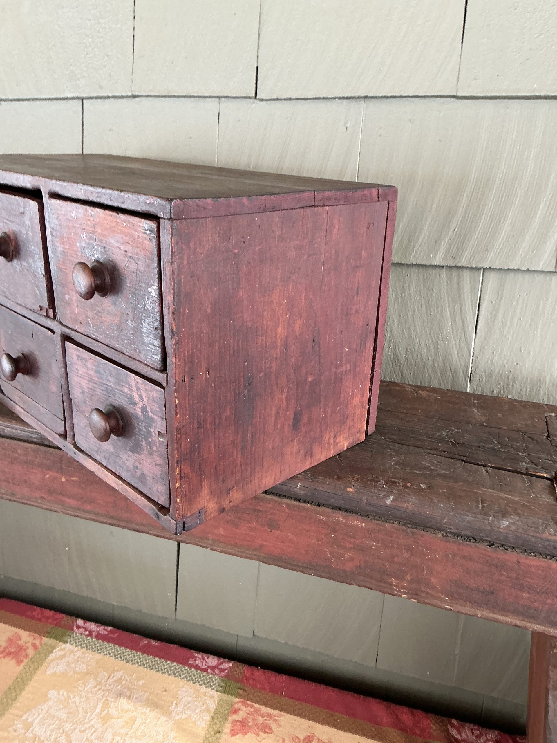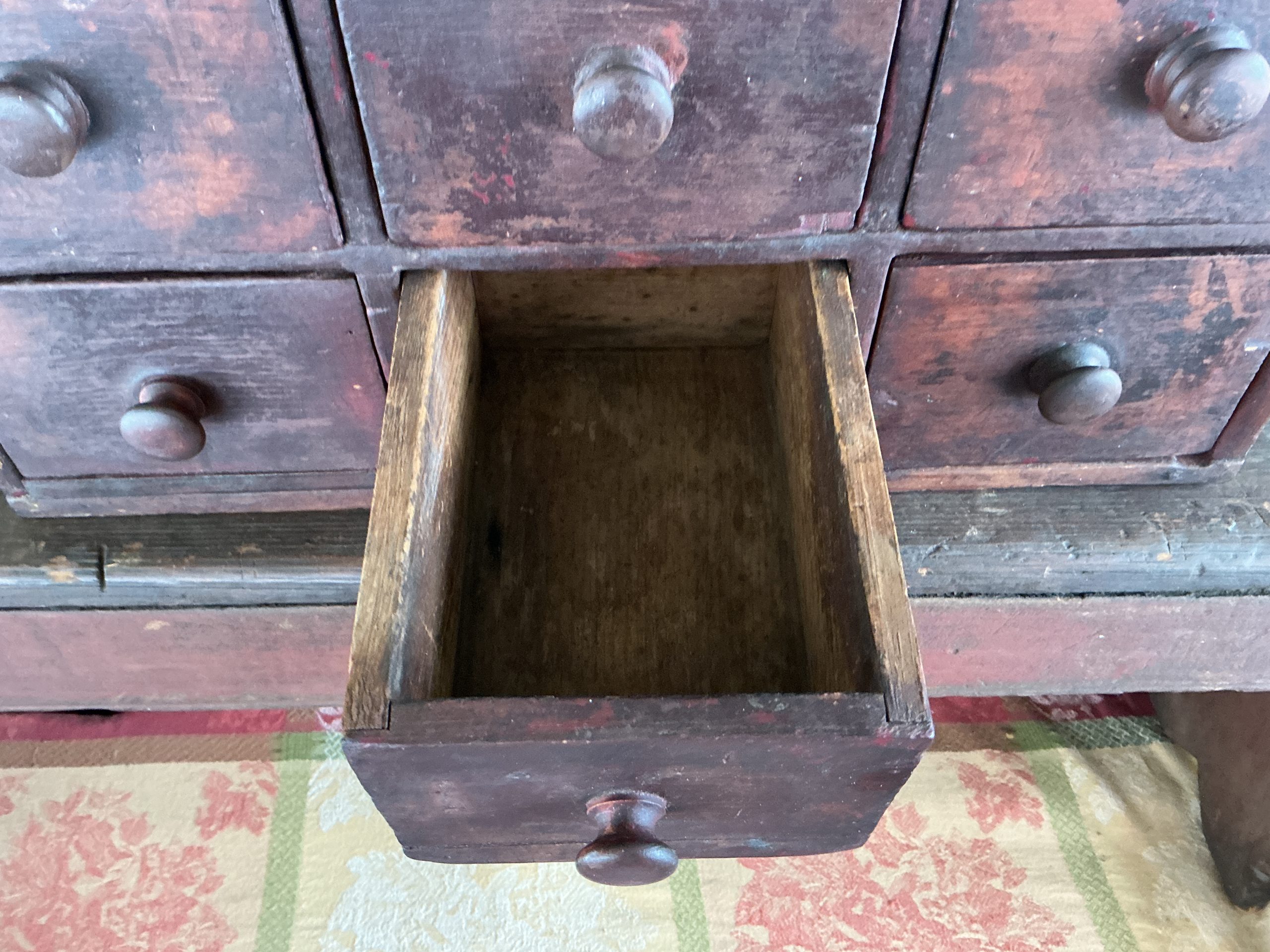 A GREAT SIZED PAINTED APOTHECARY WHICH IS SMALL ENOUGH TO BE PLACED ANYWHERE AND WOULD ADD NEEDED STORAGE TO THE ANY ROOM IN THE HOME. THIS SIX DRAWER (TWO ROWS OF THREE) UTILIZES SQUARE AND T-NAIL CONSTRUCTION, MAINTAINS ITS ORIGINAL KNOBS AND IS IN GOOD CONDITION. (OTSDK)