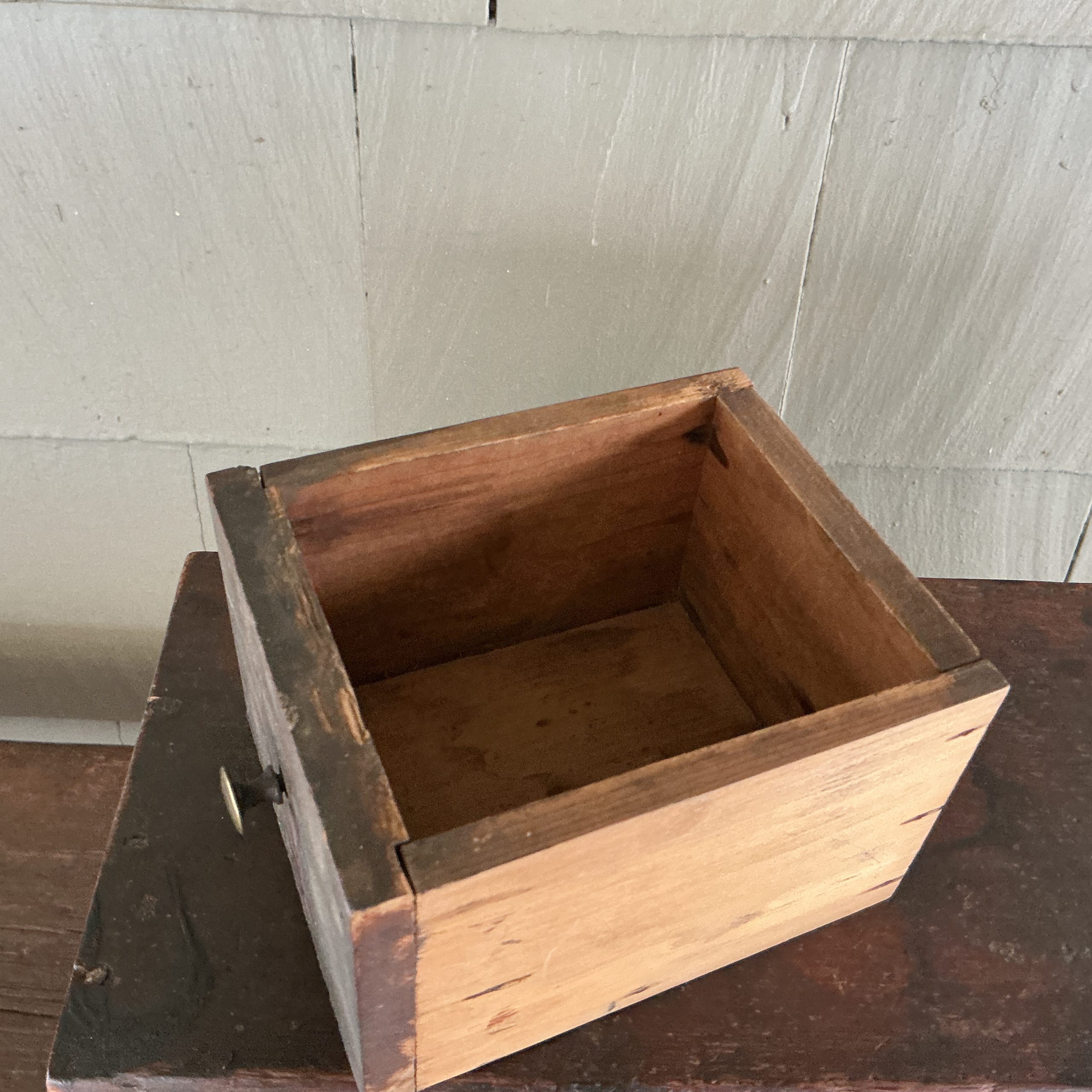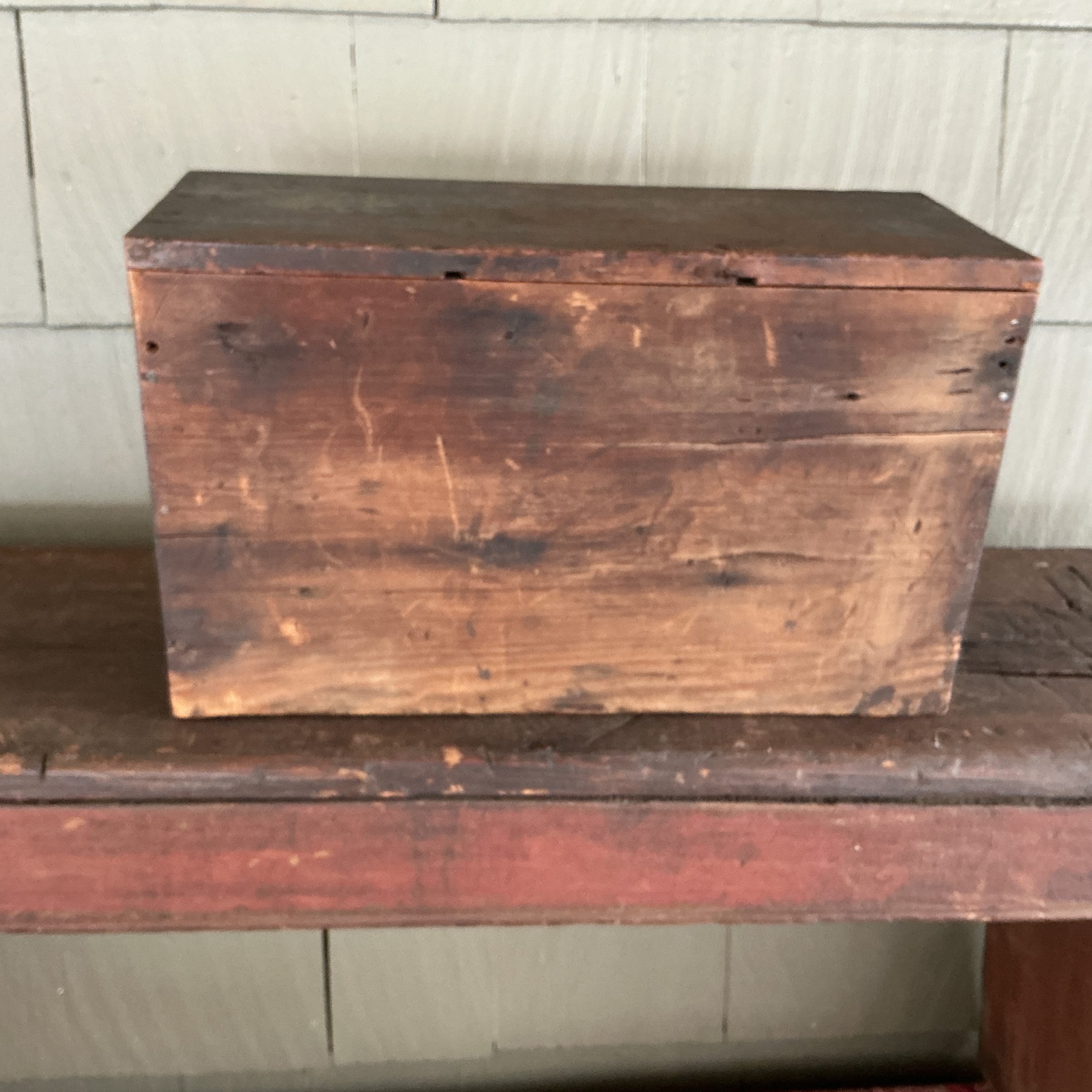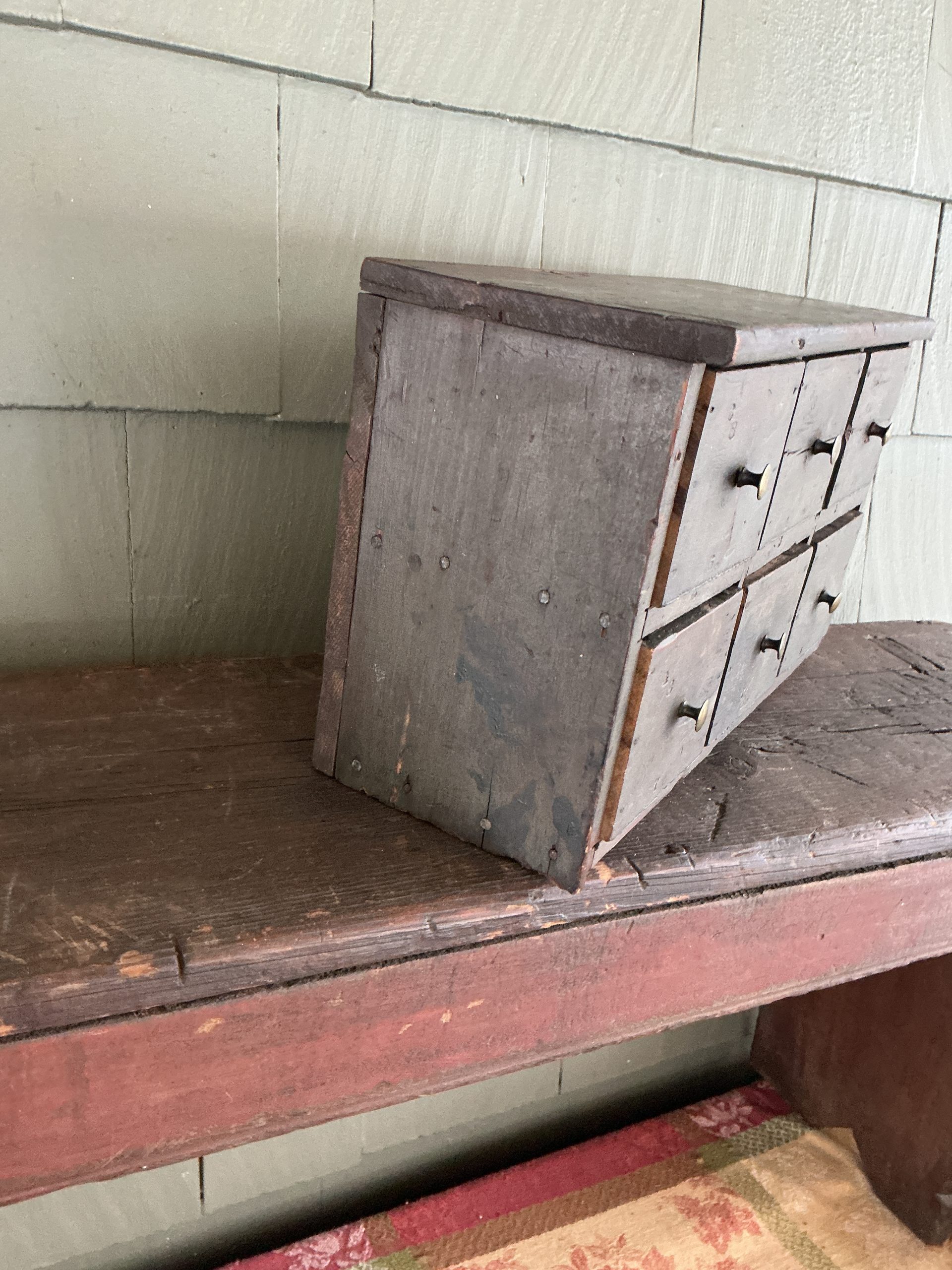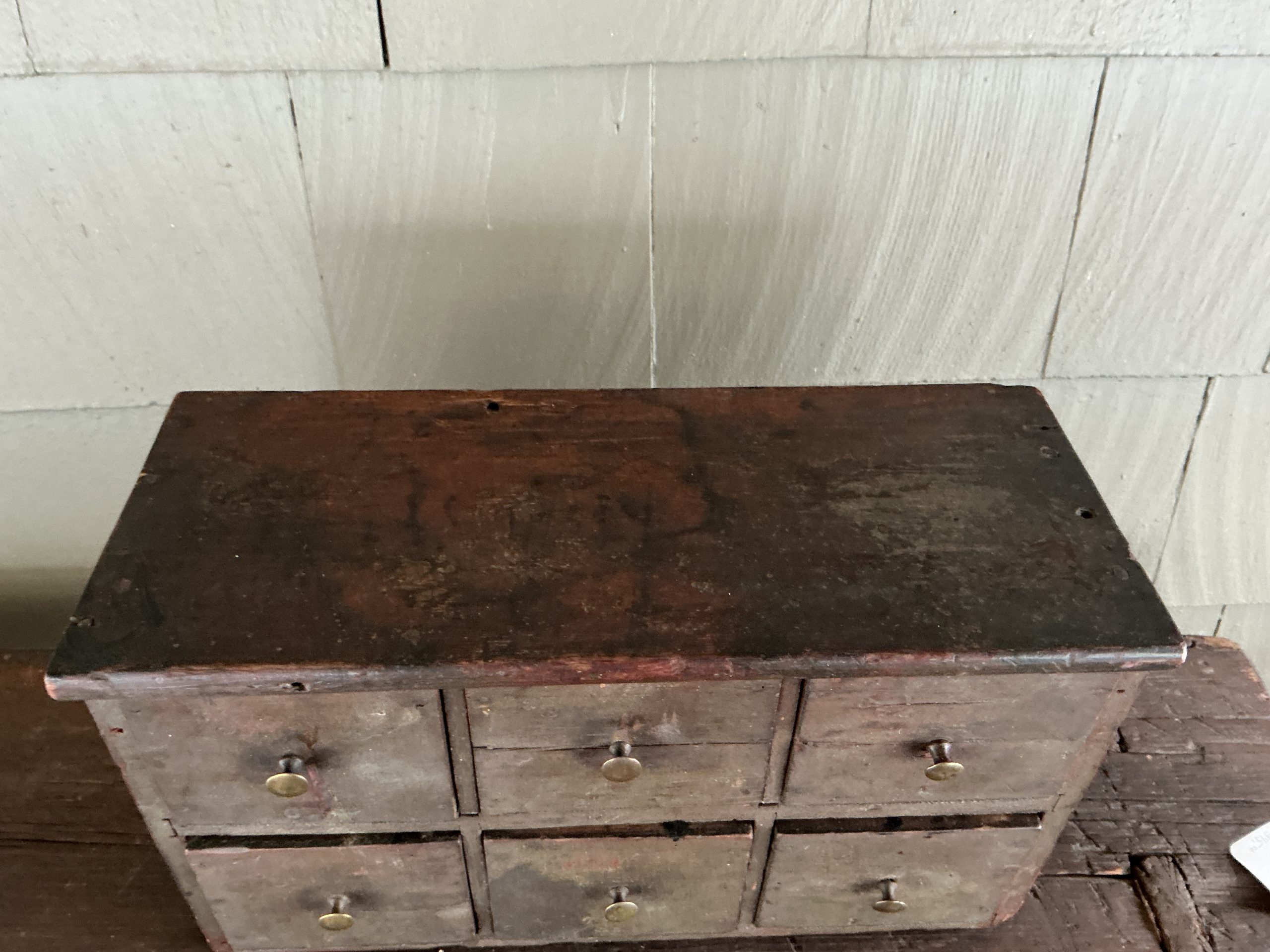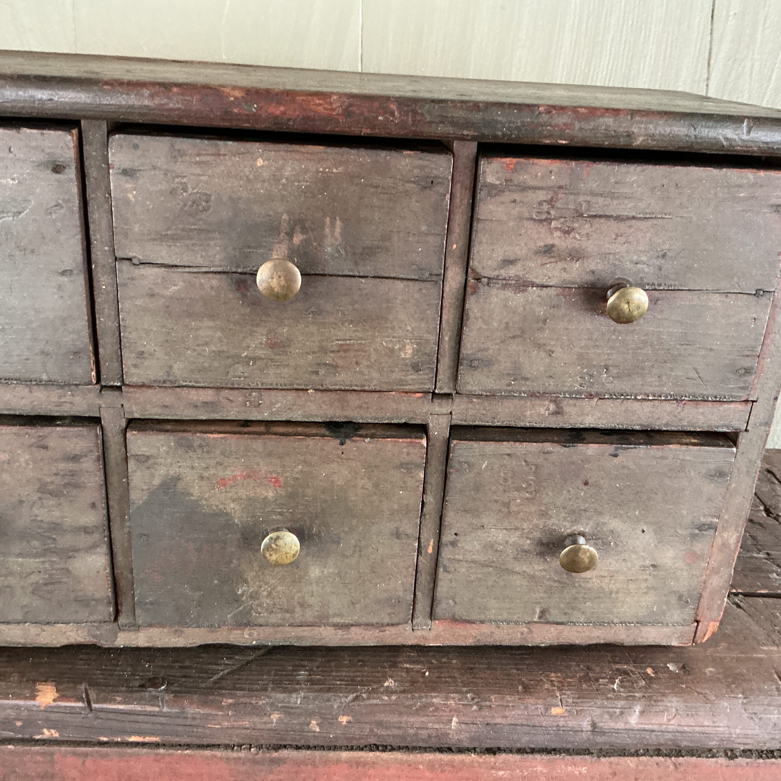 A SIX DRAWER APOTHECARY FEATURING THE ORIGINAL PAINT, SQUARE AND T-NAIL CONSTRUCTION, ORIGINAL PULLS AND MORTISED SHELVES. NICELY MADE. THE 6 DRAWER CABINET IS IN EXCELLENT CONDITION. HOWEVER, TWO OF THE DRAWERS (2 AND 3 TOP ROW) HAVE A TIGHT CRACK. IT APPEARS THAT BOTH CRACKS WERE THE RESULT OF ATTACHING THE BRASS KNOBS AT THE TIME THE APOTHECARY WAS MADE. AN ATTRACTIVE PIECE THAT CAN BE USE IN ANY ROOM. (STSKD)