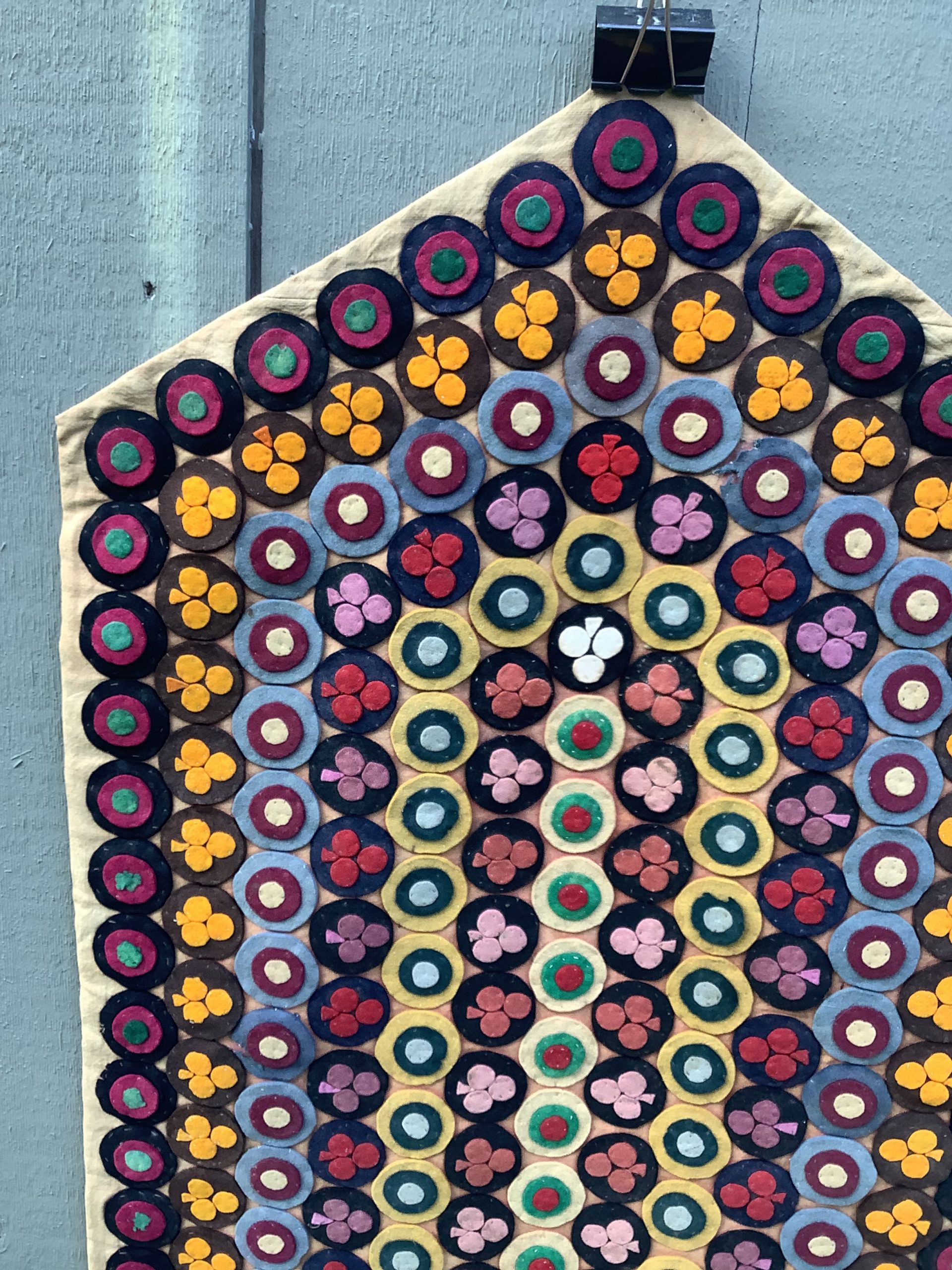 Home / Recent Additions: New to the website and Special Items / ANTIQUE WOOLFELT PENNY TABLE RUG ANTIQUE WOOLFELT PENNY TABLE RUG Description Description APPLIED FELT PENNIES SHAPED ENDS 36”L X 21”W LIST PRICE: $675. (ALKT)