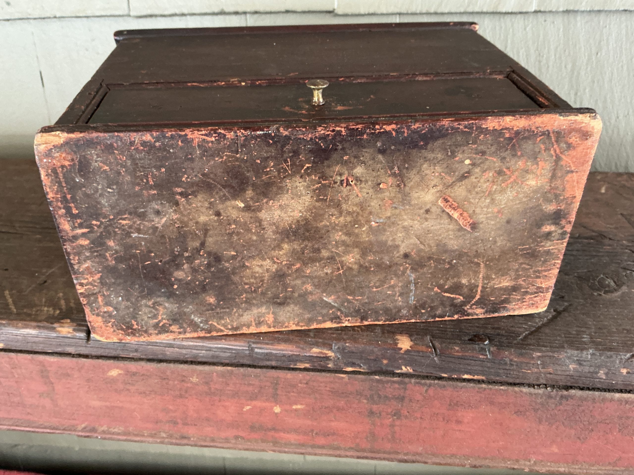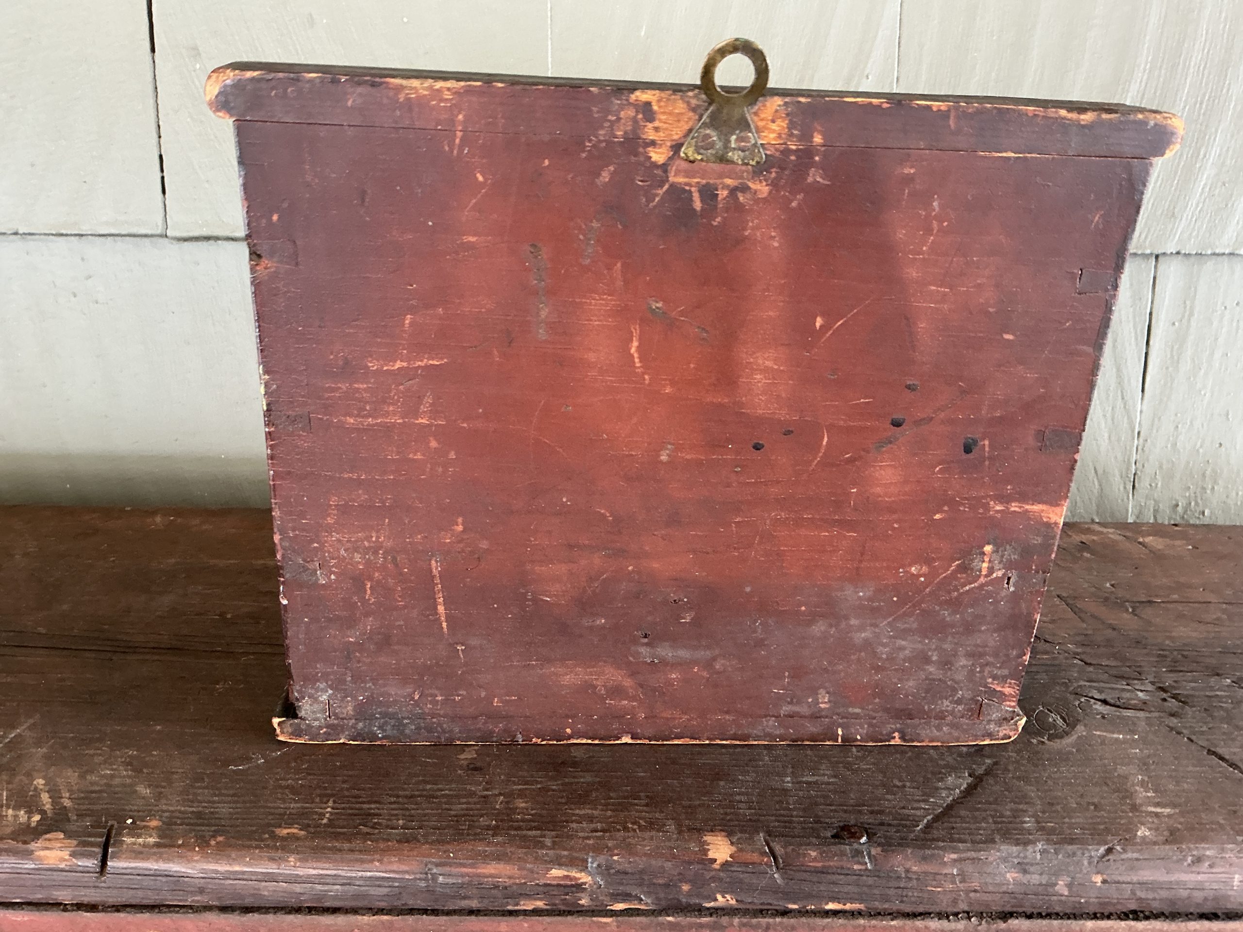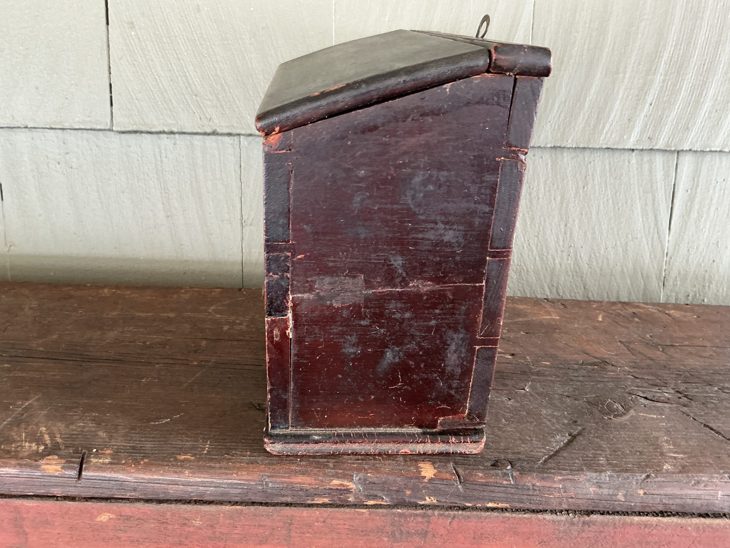 A WELL MADE PAINTED, DOVETAILED, WALL/TABLE BOX WITH DOVETAILED DRAWER, SOME T-NAILS AND SLANTED HINGED LID. THE BOX RETAINS ITS ORIGINAL BRASS HINGES AND ORIGINAL BRASS PULL. OUTSTANDING CONDITION. (RTADK) DIMENSIONS:10”L X 8 3/8”H (BACK),7”H (FRONT), 4 7/8”D LIST PRICE:$1350