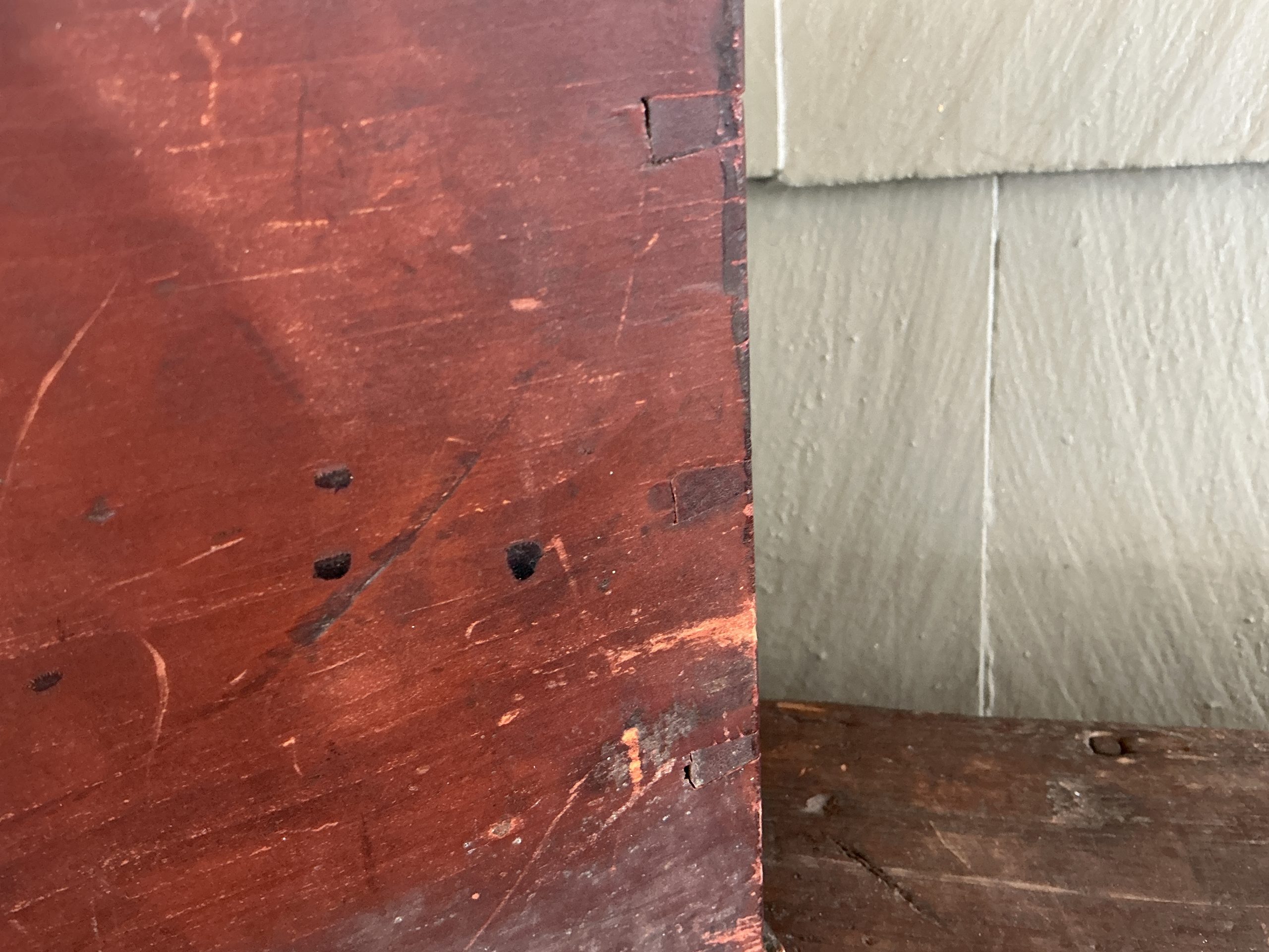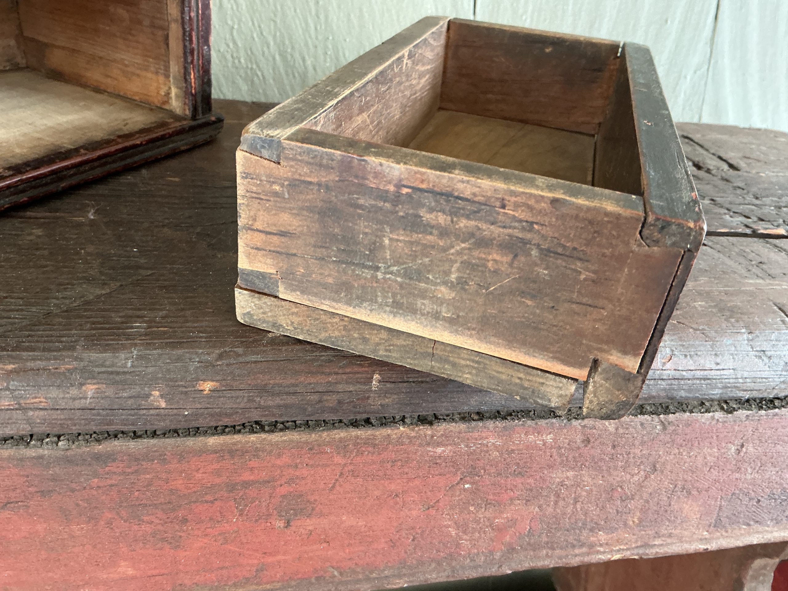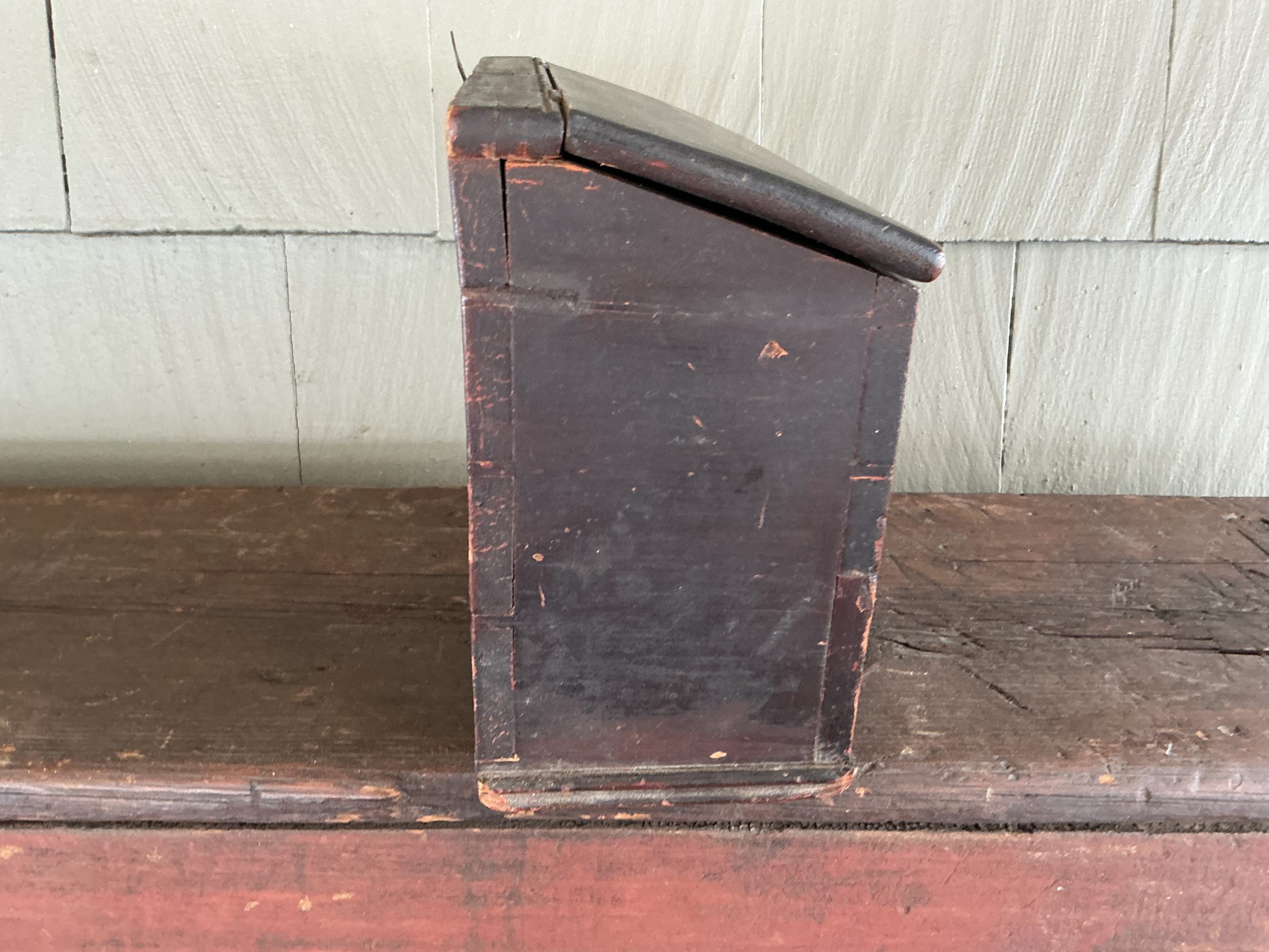 A WELL MADE PAINTED, DOVETAILED, WALL/TABLE BOX WITH DOVETAILED DRAWER, SOME T-NAILS AND SLANTED HINGED LID. THE BOX RETAINS ITS ORIGINAL BRASS HINGES AND ORIGINAL BRASS PULL. OUTSTANDING CONDITION. (RTADK) DIMENSIONS:10”L X 8 3/8”H (BACK),7”H (FRONT), 4 7/8”D LIST PRICE:$1350