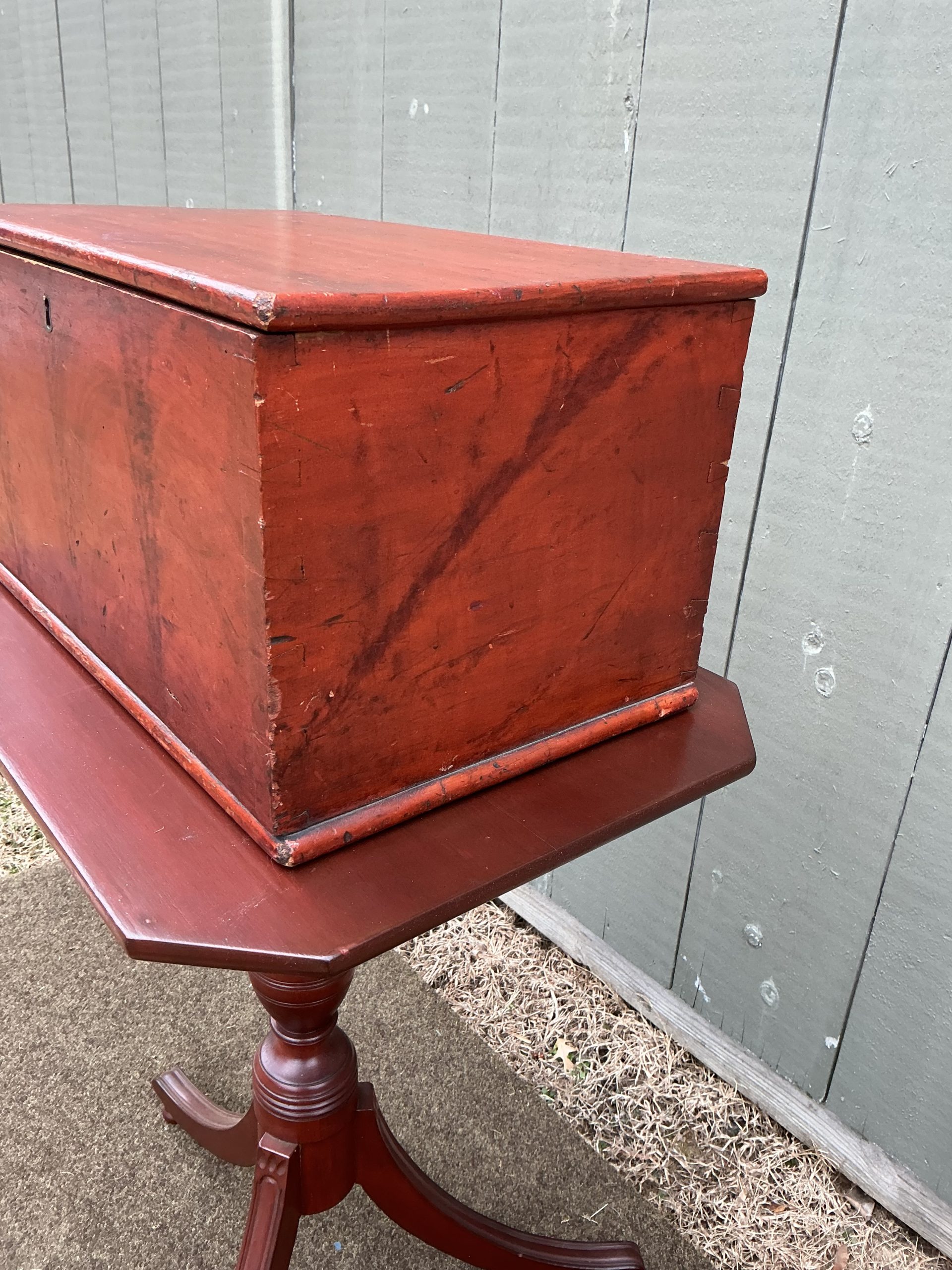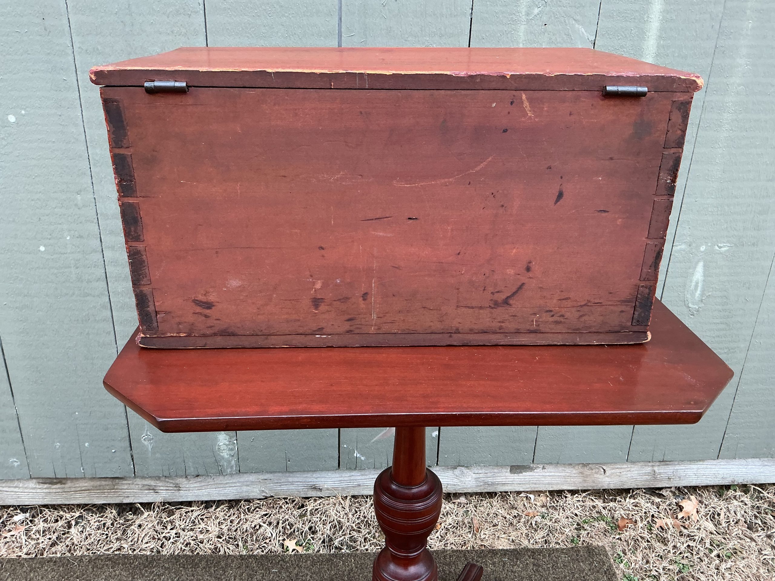 A great looking small (18 1/2”L x 11”W x 9 5/8”) dovetailed blanket chest with original till, paint, lock (no key) and hinges. This ca.1840 chest is a true 6 board with two battens on the lid. The limited use of sponge paint adds to the overall attractiveness of this painted piece. As one can tell from the photos, the chest is in excellent condition. (HTEDDE)