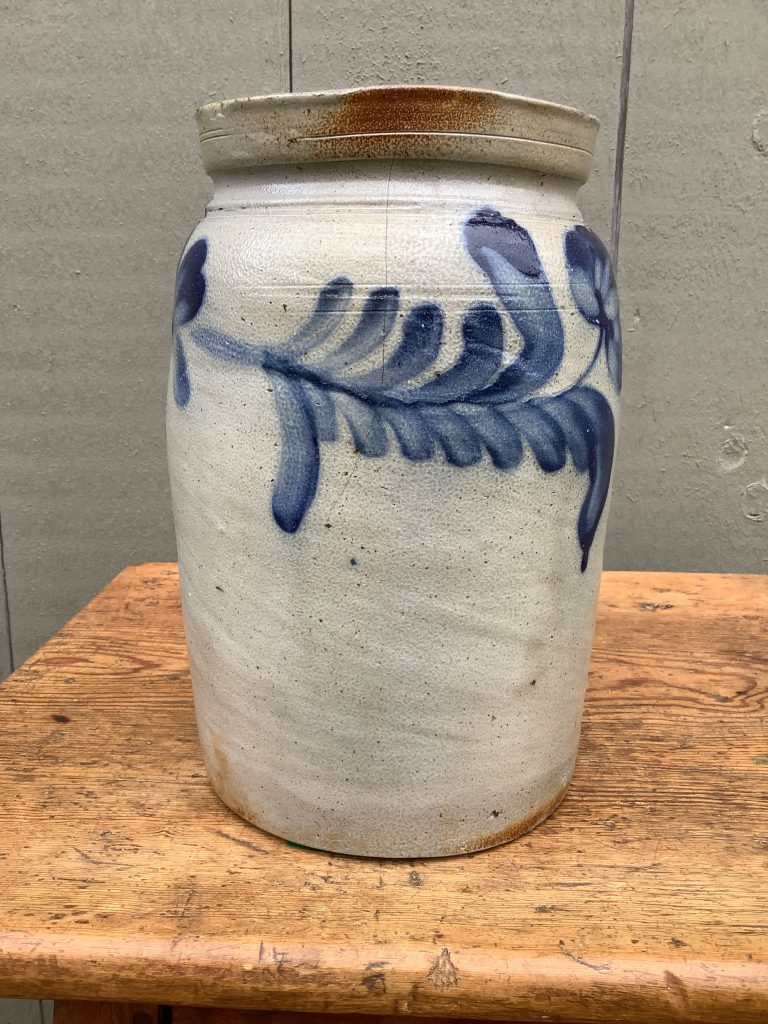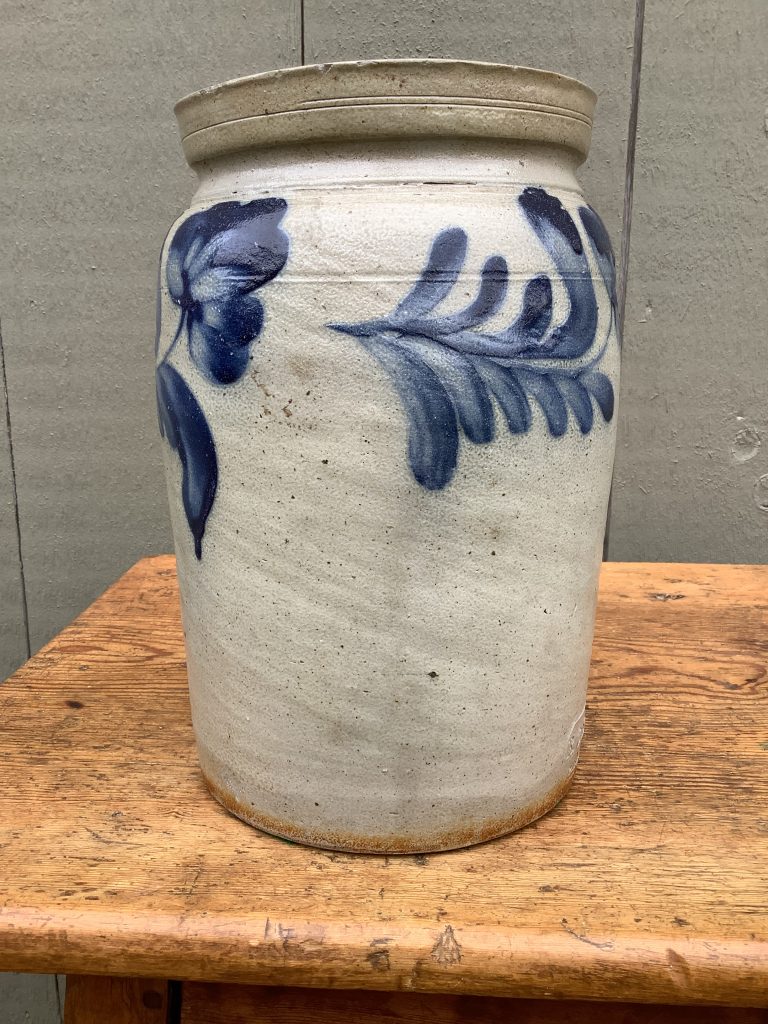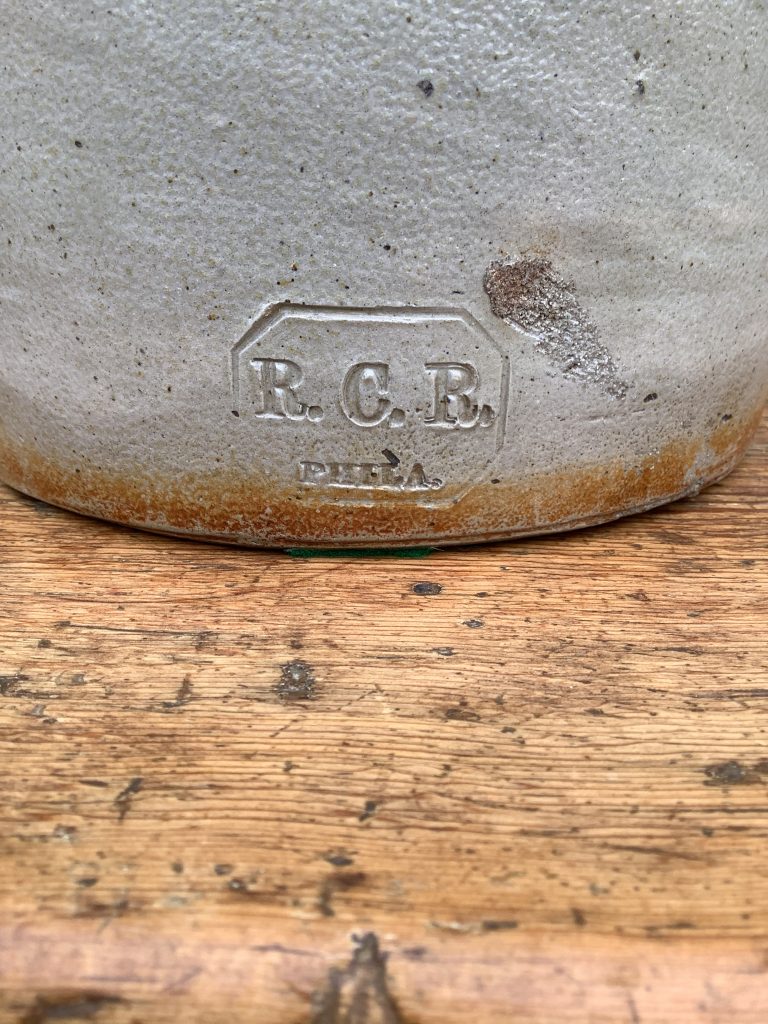 Home / Folk Art 2: Baskets, Artwork, Stoneware / STONEWARE PRESERVE JAR – SIGNED RCR (REMMEY)PHILIA. STONEWARE PRESERVE JAR – SIGNED RCR (REMMEY)PHILIA. Description Description A SIGNED REMMEY (RCR -RICHARD C. REMMEY PHILA.) ca:1880 PRESERVE JAR WITH COBALT BLUE FLORAL DECORATION. HAS A VERY, VERY TIGHT HAIRLINE.10 1/4”H, 6” DIA. LIST PRICE:$695 (CKTE)