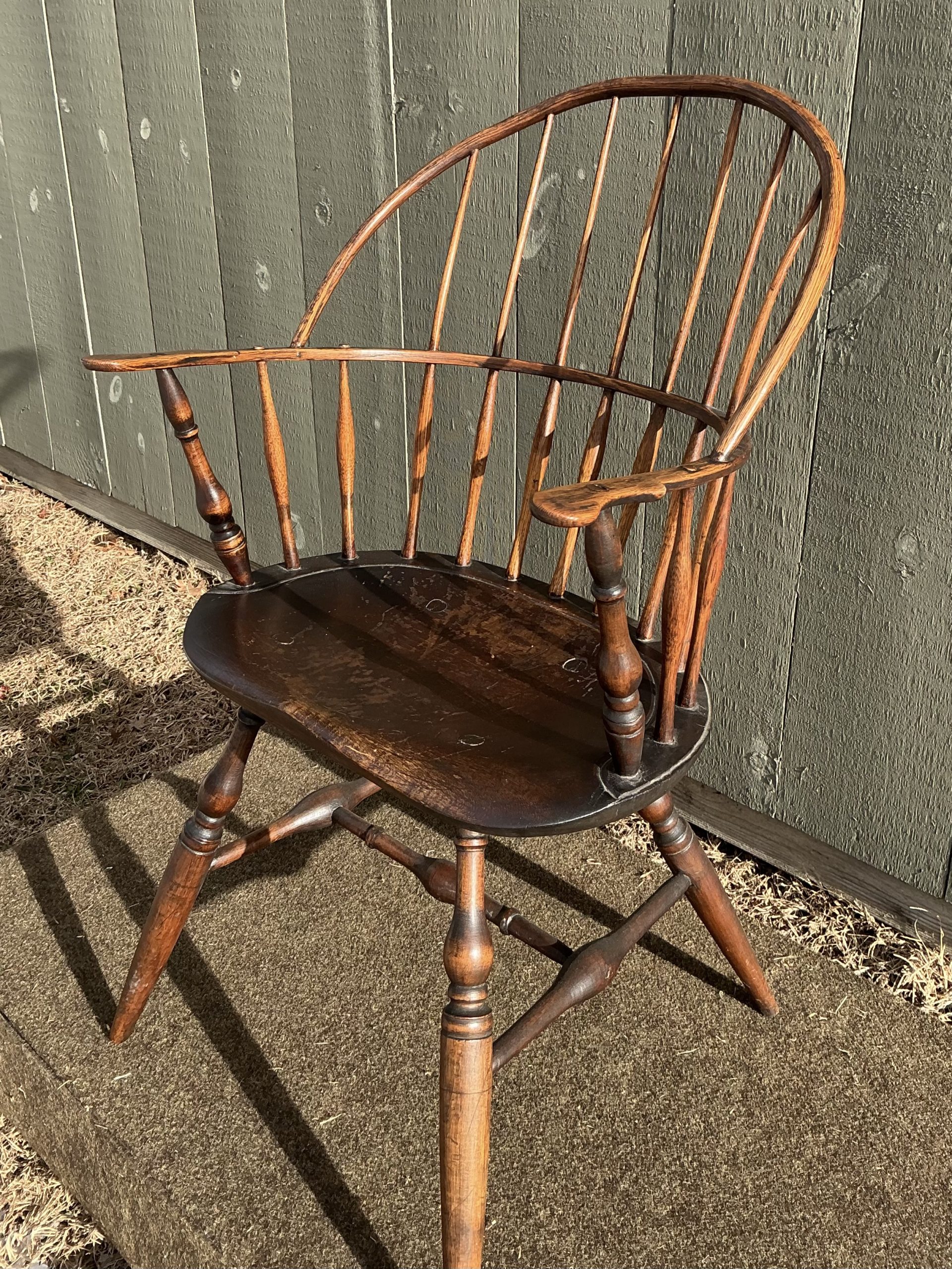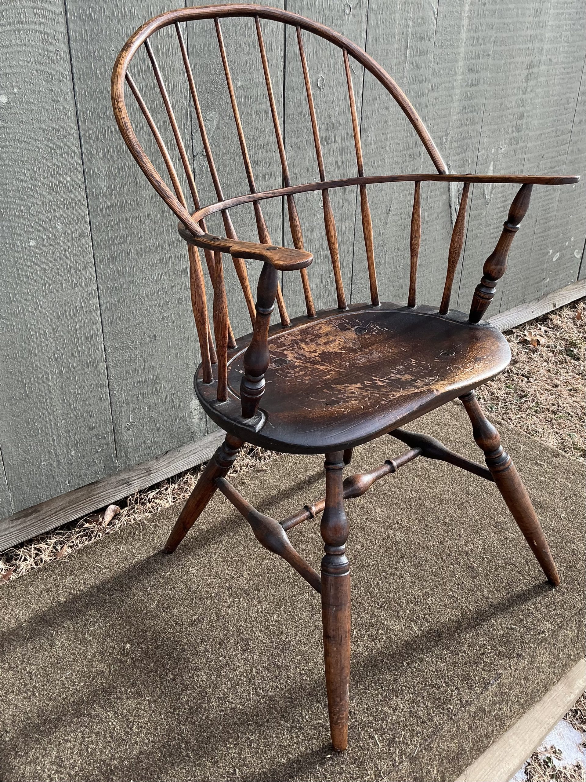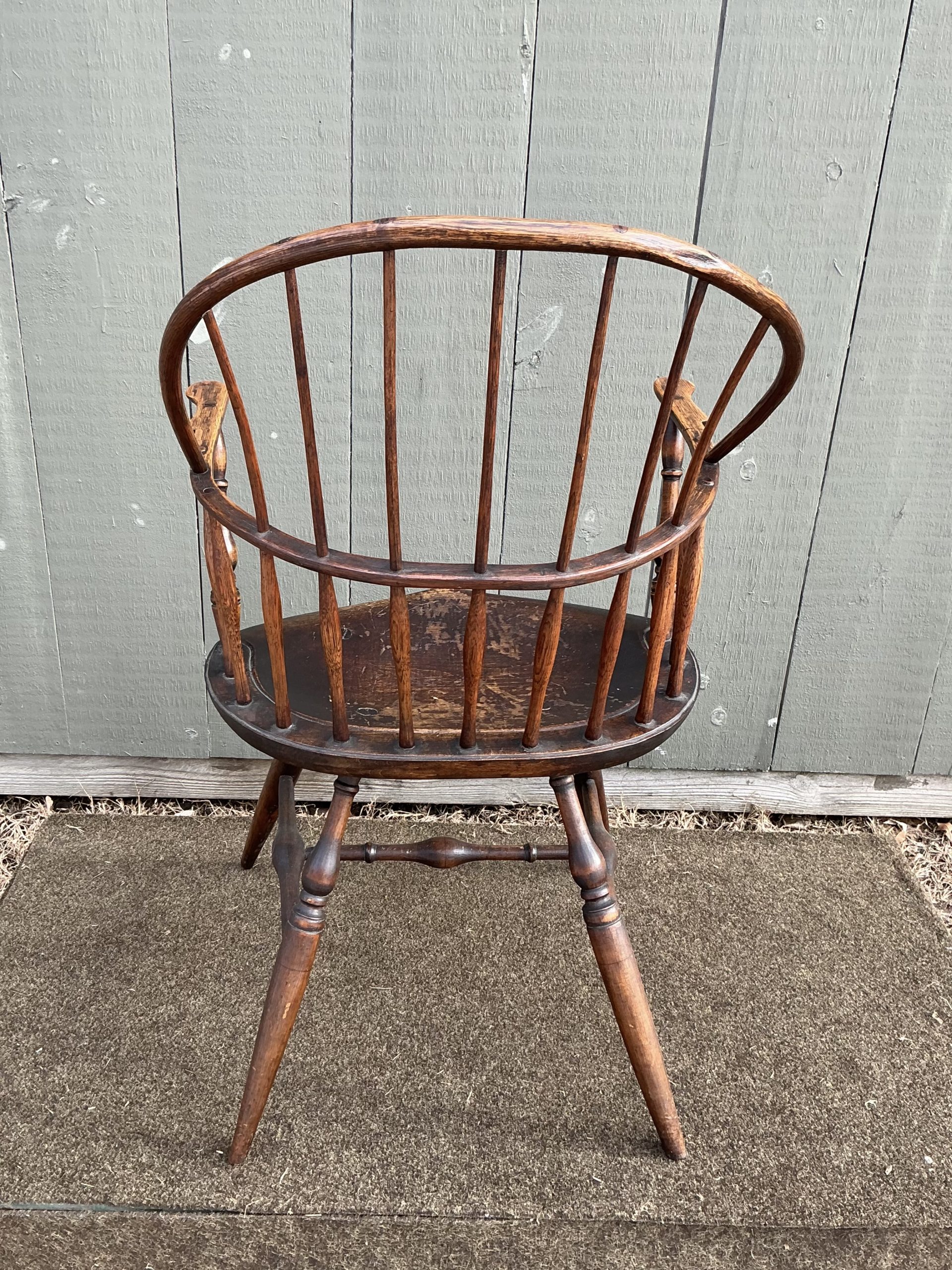 A delicate 1765-1780 Pennsylvania Windsor sack-back armchair. The armchair has all the traditional features of a period Pennsylvania bowed back Windsor chair, such as splayed legs, flat shaped arms, bulbous stretchers (center stretcher with small rings), carved saddle seat and seven tapered spindles with a mid support. Note that the upper part of the spindle was carved a little more than the lower part to give a more delicate look with solid support and the carved legs and arm supports are particularly graceful. Excellent condition with original finish. Height:36”. (BDKTCKP)
