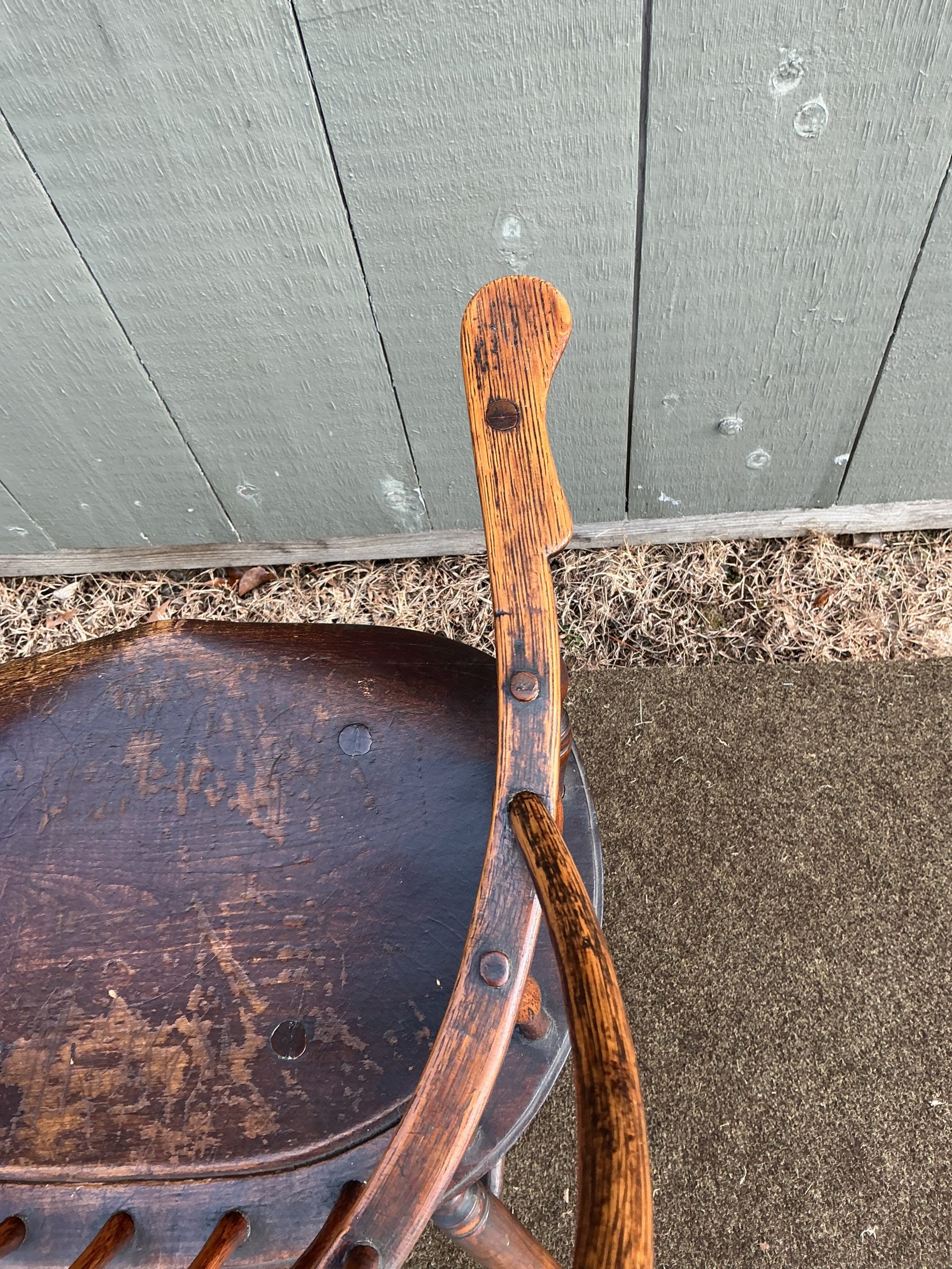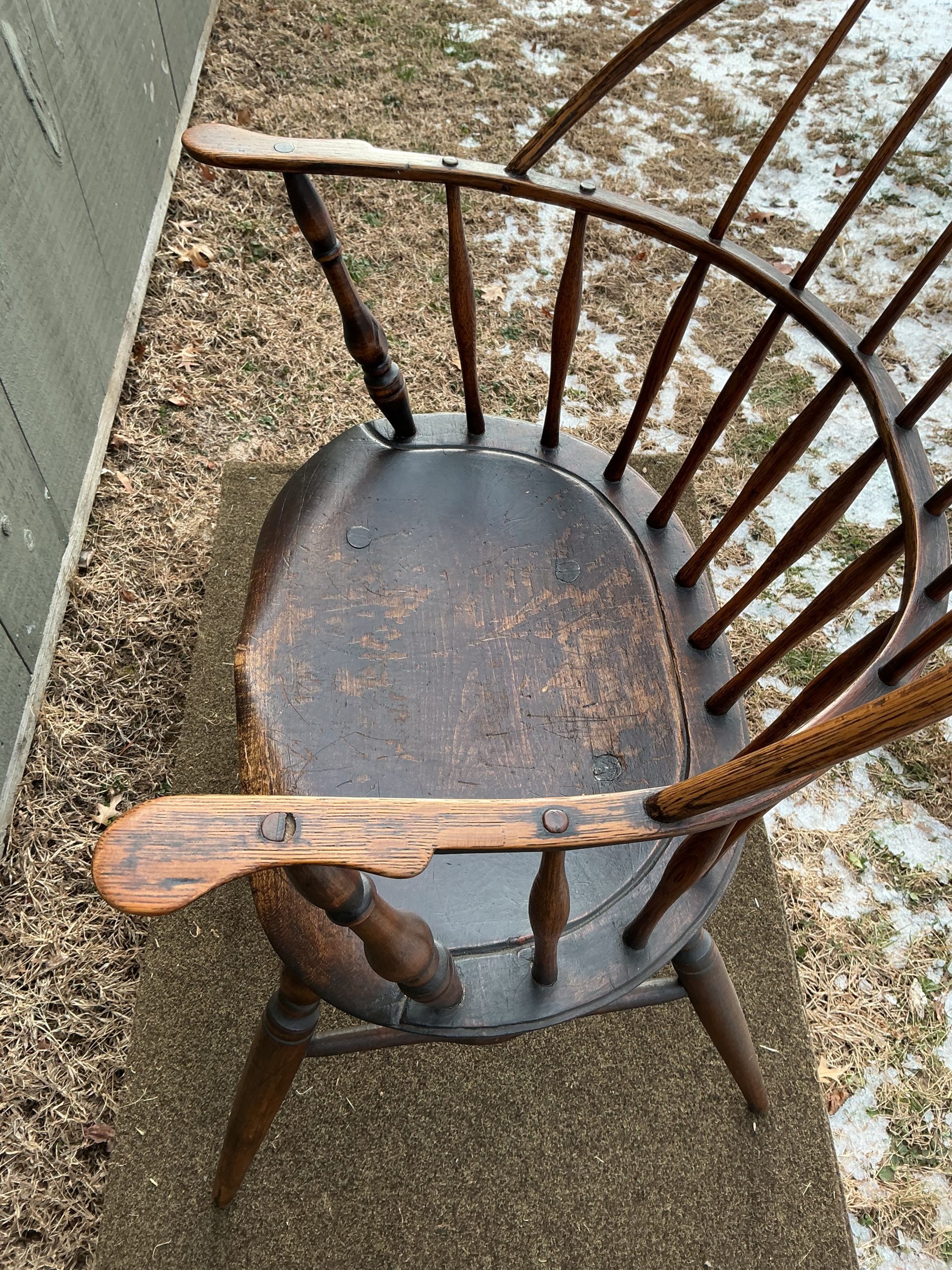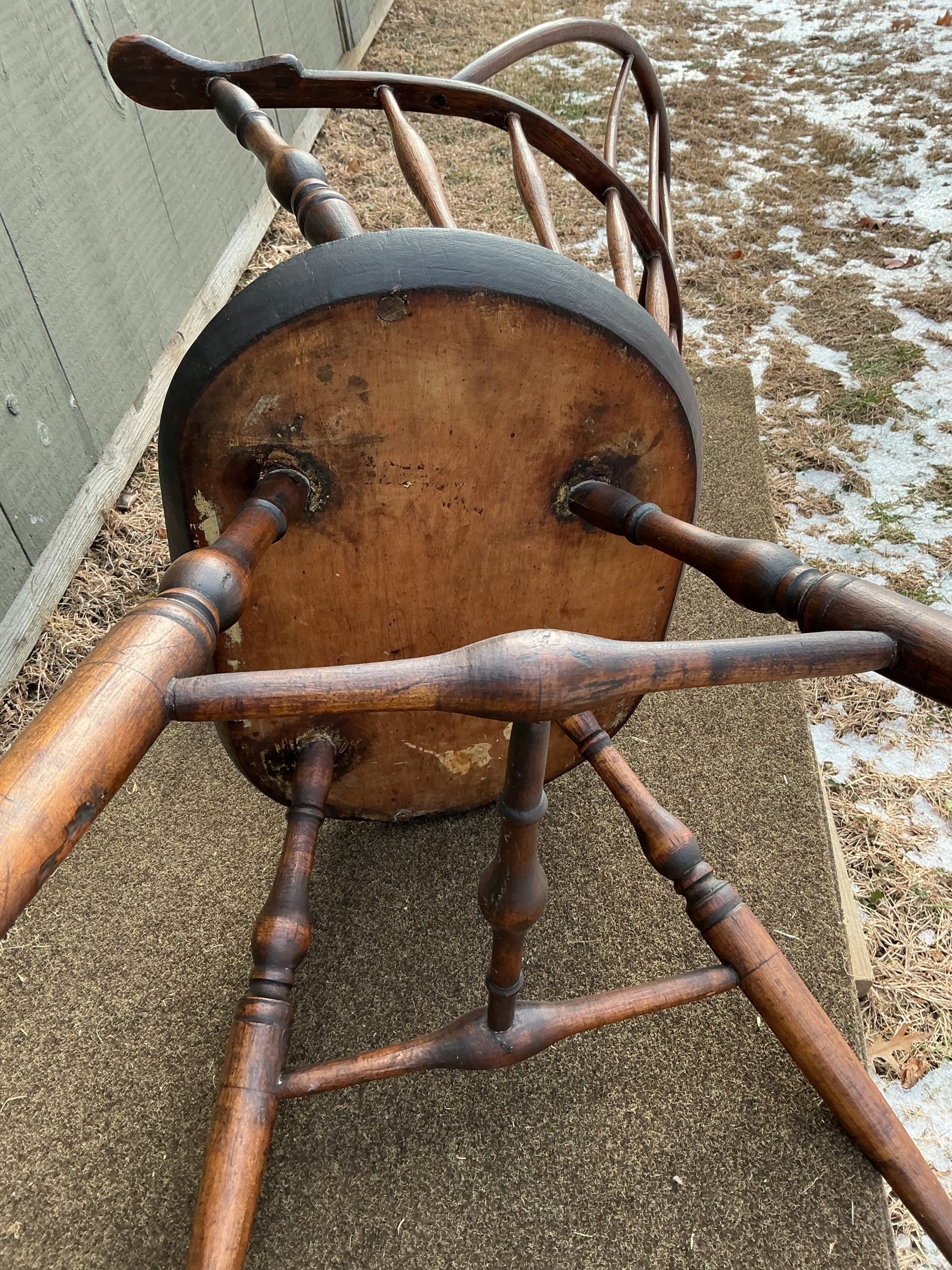 A delicate 1765-1780 Pennsylvania Windsor sack-back armchair. The armchair has all the traditional features of a period Pennsylvania bowed back Windsor chair, such as splayed legs, flat shaped arms, bulbous stretchers (center stretcher with small rings), carved saddle seat and seven tapered spindles with a mid support. Note that the upper part of the spindle was carved a little more than the lower part to give a more delicate look with solid support and the carved legs and arm supports are particularly graceful. Excellent condition with original finish. Height:36”. (BDKTCKP)